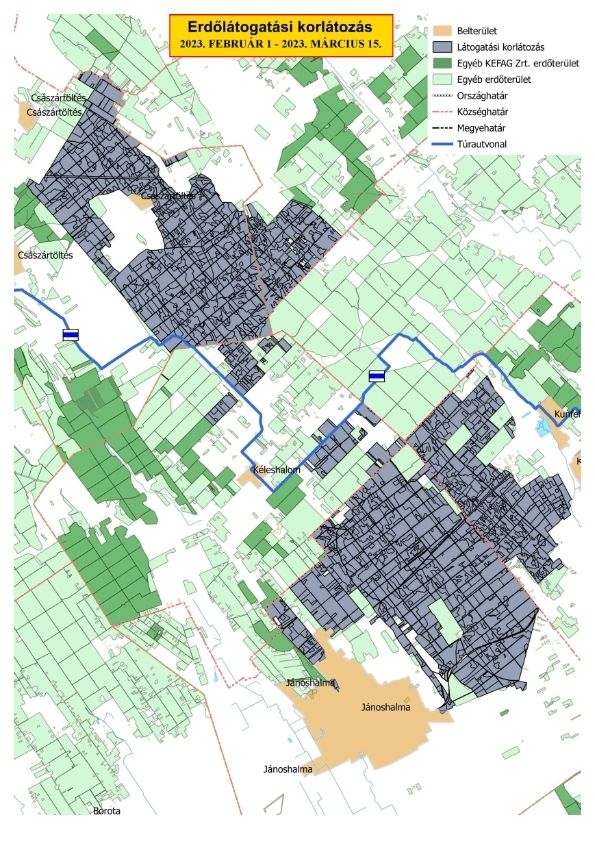 A látogatási tilalom (február 01-től 2023. március 15-ig) alatt mindennap 0.00 és 24.00 óra közötti napszakban tilos az erdőlátogatás. A Kiskunhalas közelében látogatás tilalma alá eső területek például a Jánoshalma – Kunfehértó közötti erdős részek, a Kéleshalmi Ősborókás bizonyos területe és a Császártöltéstől keletre húzódó erdők. Ezek részben érintik az országos kéktúra útvonalát, amely viszont látogatható. A KEFAG Zrt. kéri, hogy az említett időszakban csak a térképen megjelölt útvonalakat használják.