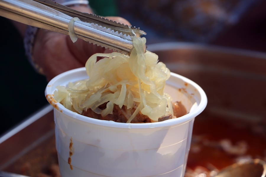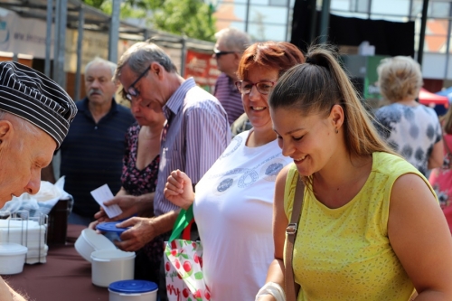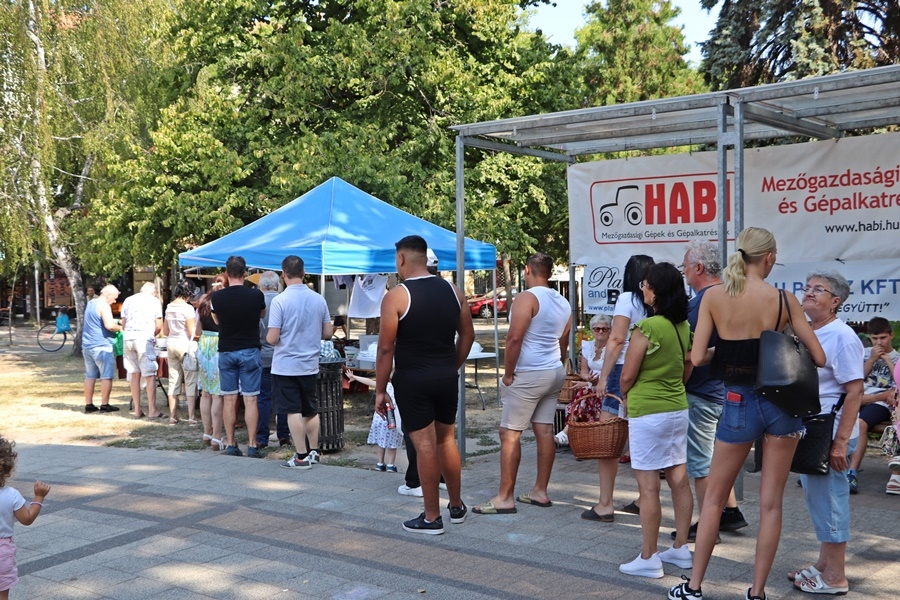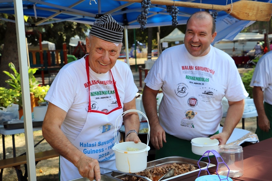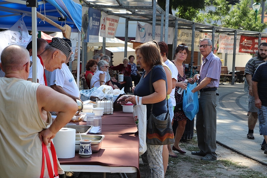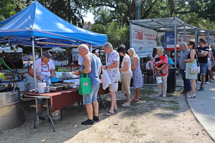 Sós Dezső életműdíjas közétkeztetési mesterszakács és segítői kora reggel óta szorgoskodtak a nagyméretű főzőedény körül. Háromszáz adagnyit készítettek a helyi finomságból. Sokan elővételben megvették már az ebédjegyet, így ételhordóval érkeztek, hogy vihessenek a családnak is a finomságból.