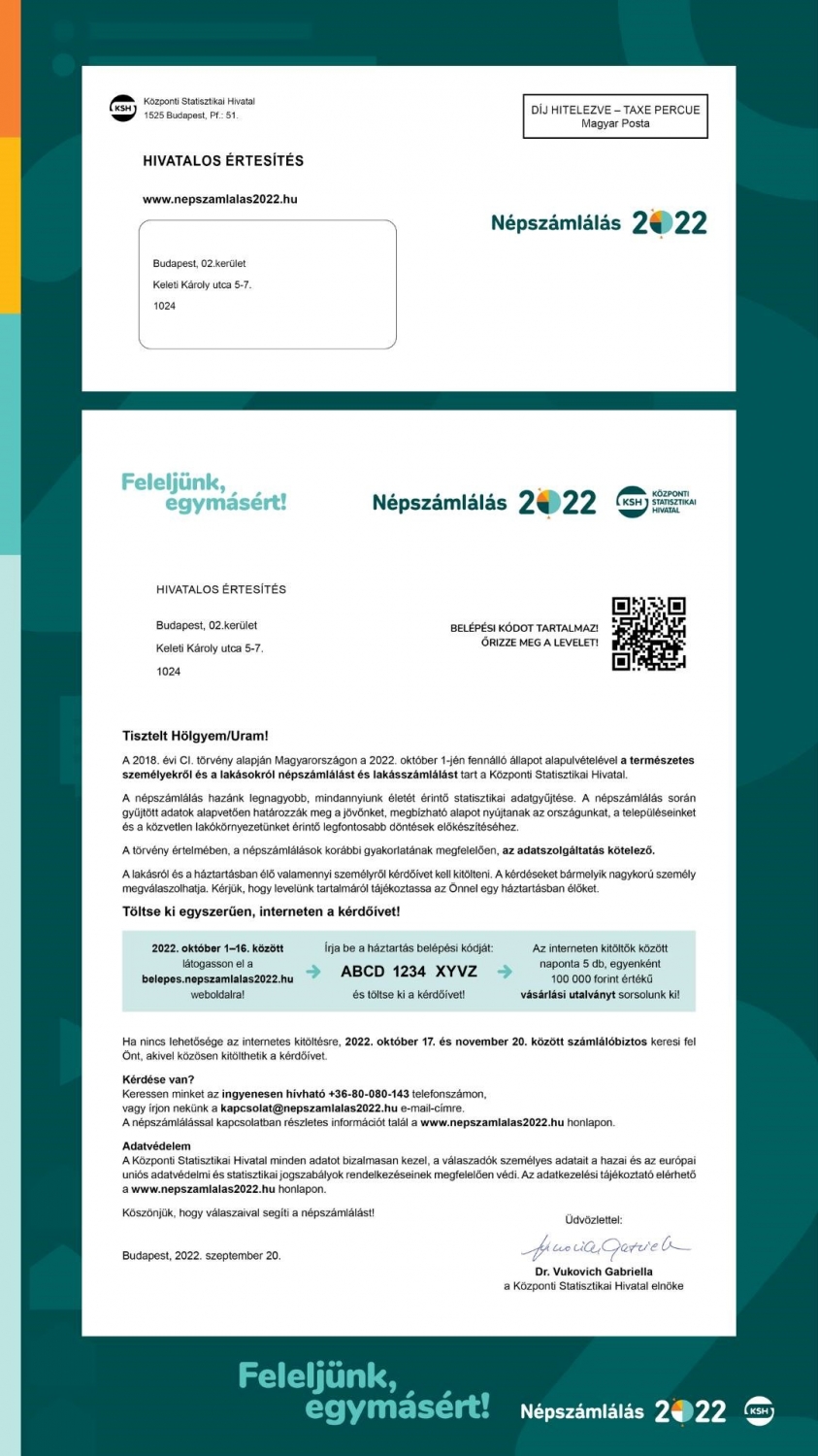 A küldeményben a népszámlálásról szóló hasznos információk mellett egy 12 jegyű belépési kód is található, ennek segítségével tudja minden háztartás önállóan, interneten kitölteni a kérdőívet.