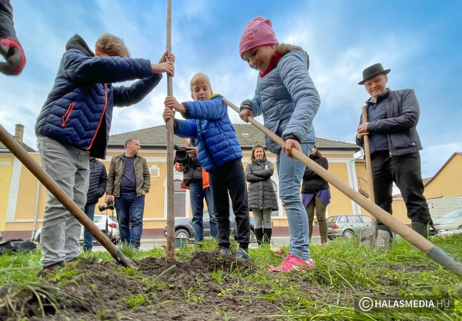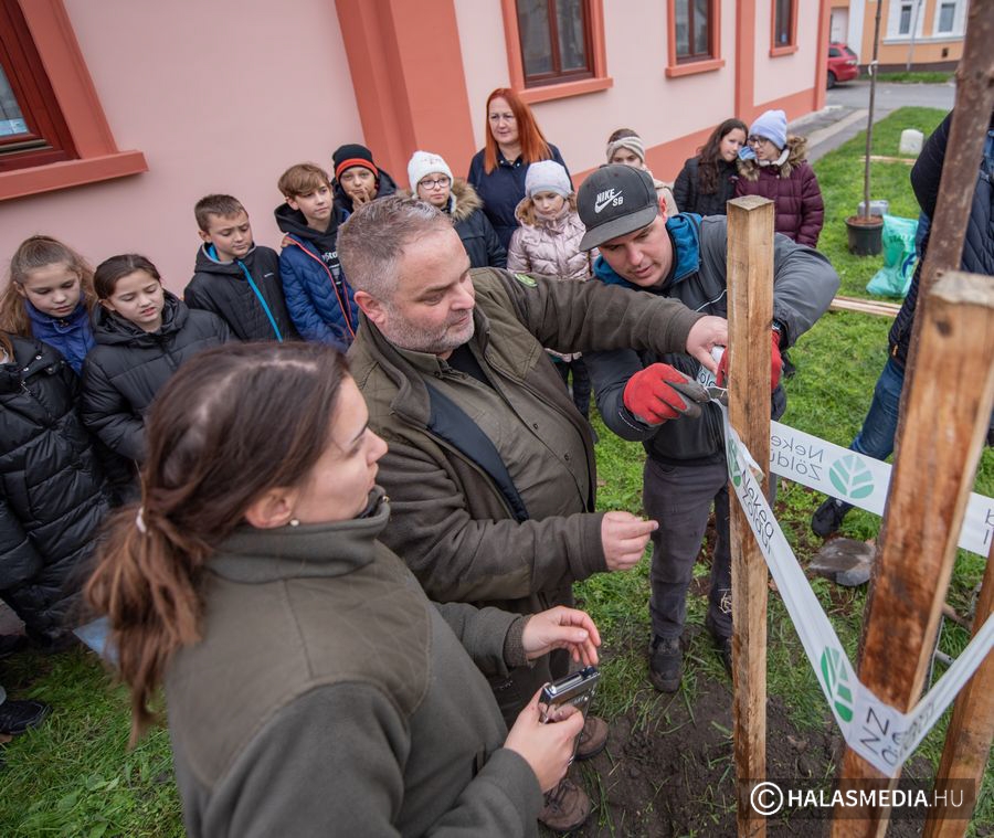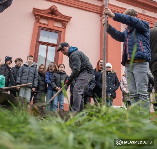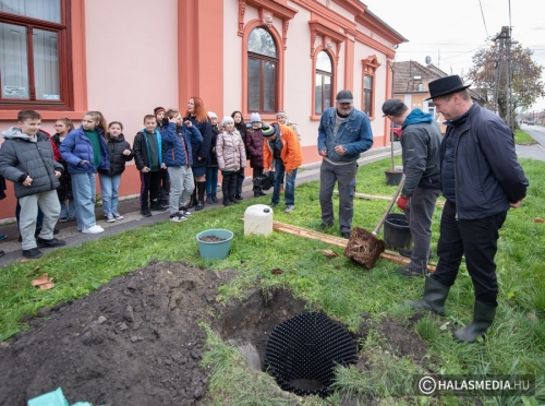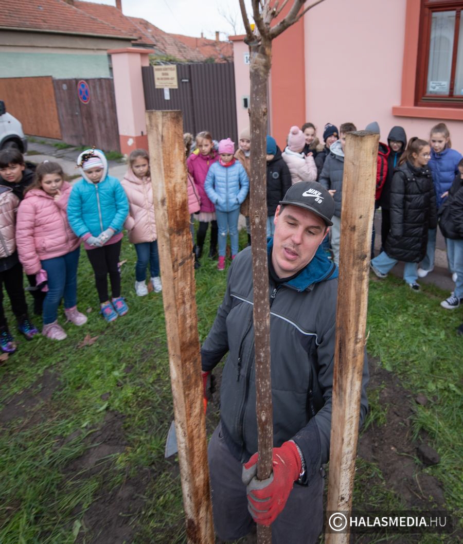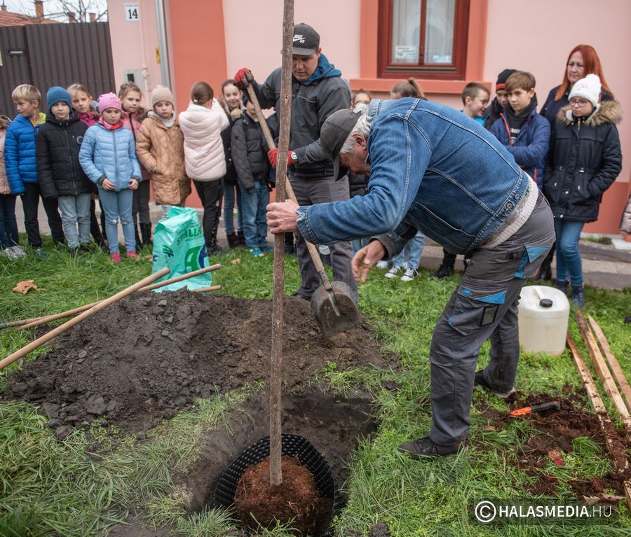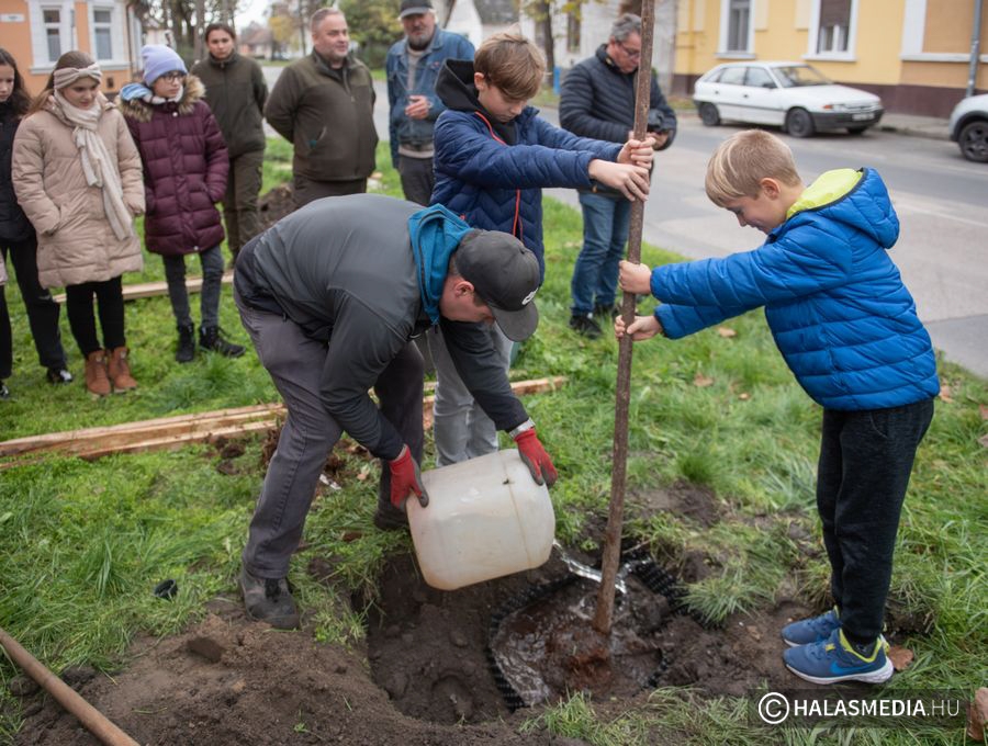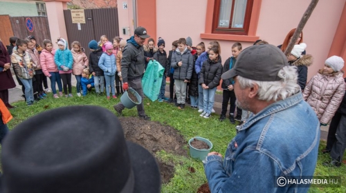 A hétfői Petőfi utcán történt faültetésen diákcsoportok is megjelentek, mi több még részt is vettek a fák elültetésében. Az érdeklődő kisdiákok a Kiskunhalasi Református Kollégium Központi Általános Iskolából érkeztek tanári kísérettel és nagy élvezettel hallgatták a faültetés tudnivalóit Greguss Viktortól.