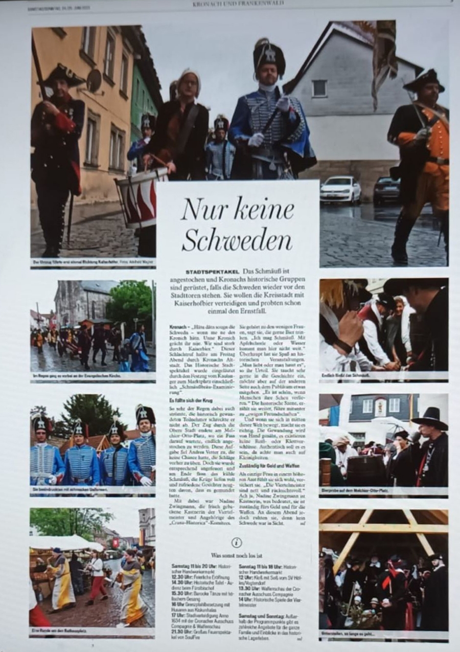 „Folyik a tréfálkozás, és Kronach történelmi csoportjai felkészültek arra az esetre, ha a svédek ismét a városkapu előtt állnak.” Ezzel a címszöveggel jelent meg a Kronachban hétvégén „Historisches Stadtspektakel” (magyarul történelmi városlátványosság) névvel folyó rendezvényről a tudósítás a Frankischer tag online hírportálon. A halasi huszárok a kronachi várvédőkkel vezették fel a történelmi ruházatban öltözött menetet. Olyasmi esemény ez Kronach életében, mint Kiskunhalason a szüreti fesztivál.