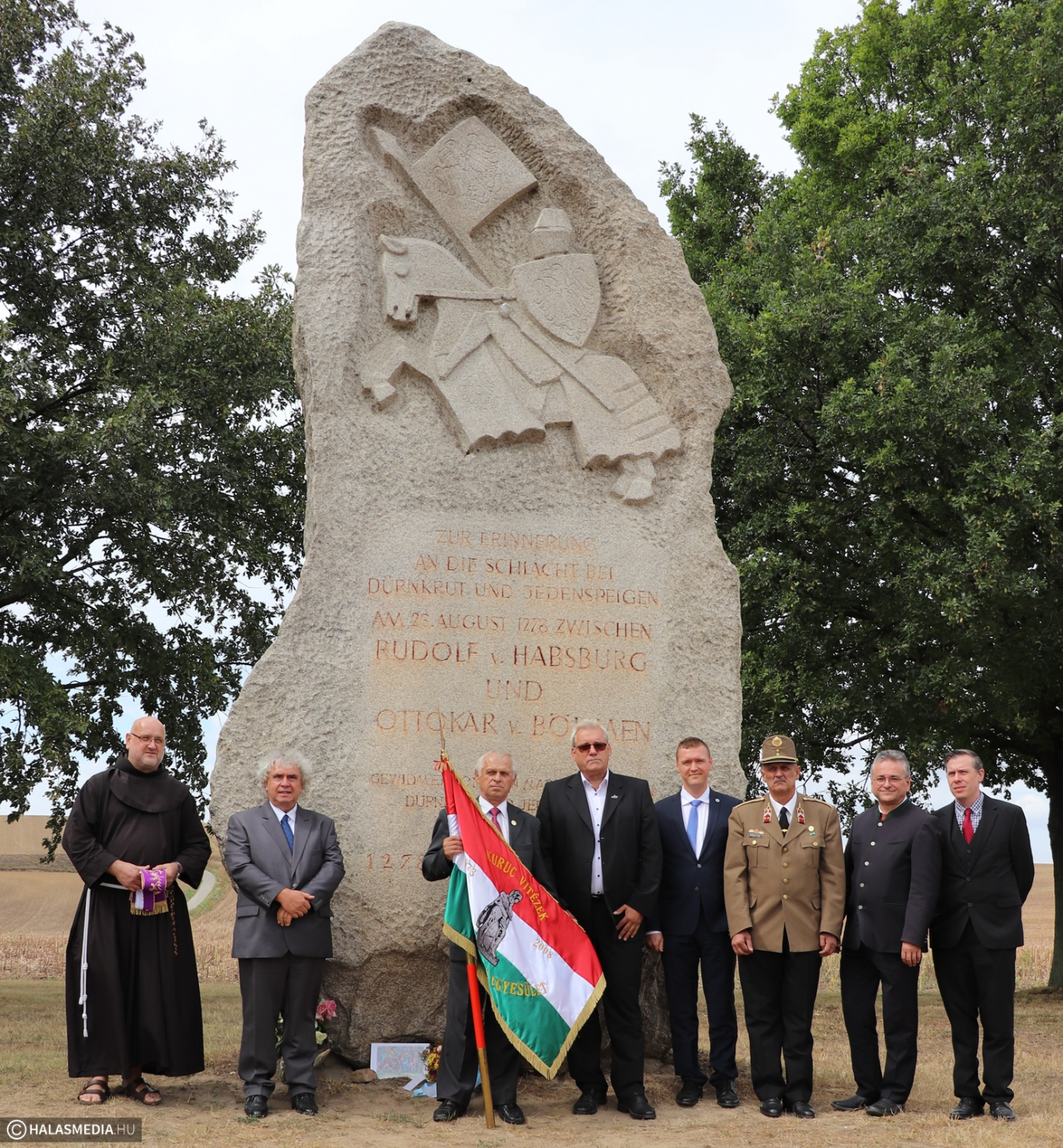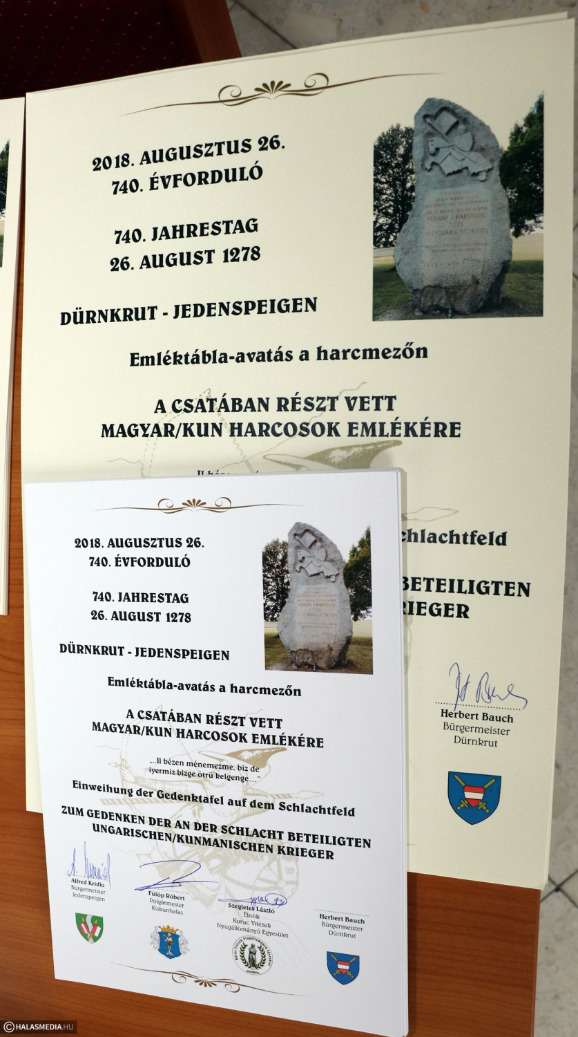 A program ünnepi szentmisével kezdődött, amelyet Bruder Elias mutatott be, ebben közreműködött a jedenspeigeni és dürnkruti vonosnégyes. A megemlékezésen Wolfgang Galler osztrák történész idézte fel az 1278. augusztus 26-i csatát, amelyben Habsburg Rudolf hadereje csapott össze Ottokár cseh seregével. A szakember szinte tökéletes magyarsággal köszöntötte a halasiakat, előadásában pedig hangsúlyozta: a mai napig sokat vitatkoznak a történészek a csata részleteiről. Fülöp Róbert Kiskunhalas polgármestere azt hangsúlyozta, az osztrák fogadtatás, hozzáállás bizonyíték arra, hogy jó ötlet volt a halasi egyesület kezdeményezése, amelyre nagyon fogékonyak voltak a dürnkrutiak és jedensteigeniek. A városvezető bemutatta Kiskunhalast és beszélt a nevezetességeiről is az osztrák közönség előtt.