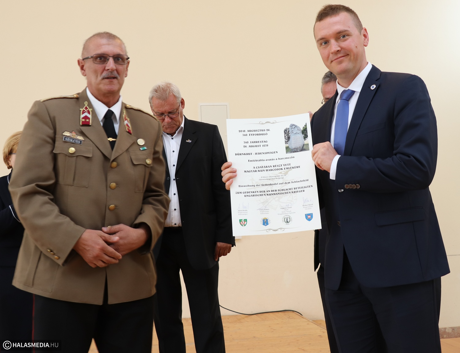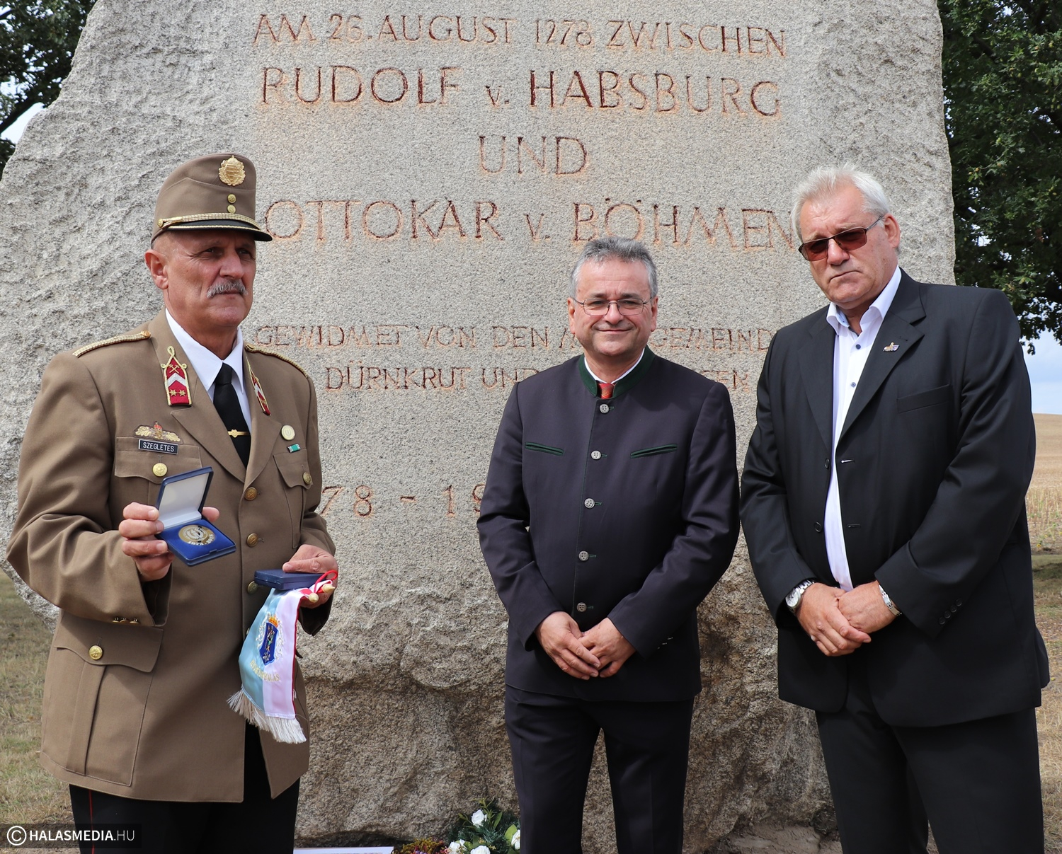 A Kuruc Vitézek Nyugállományú Egyesület szervezésében egy busznyi kiskunhalasi utazott ki vasárnap az ausztriai Dürnkrutba, ahol egy ünnepséget szerveztek a 740 évvel korábbi morva-mezei csata tiszteletére. A halasiak részvétele a rendezvényen nem véletlen, ugyanis a program során avatták fel azt az emléktáblát, amelyet Mester Sándor kezdeményezésére az egyesület, valamint Fülöp Róbert halasi, Alfred Kridlo jedenspeigeni, valamint Herbert Bauch dürnkruti polgármester segítségével sikerült megvalósítani. A kis osztrák település több száz lakója ott volt a takaros rendezvényközpontban vasárnap délelőtt, Szegletes László egyesületi elnök invitálására a halasi városvezető is részt vett az ünnepségen.