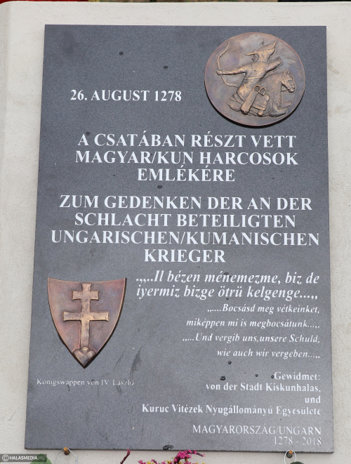 Az ünnepség második részében, a 740 évvel ezelőtti csata helyszínén avatták fel a halasiak emléktábláját, amelyen, magyar és német nyelvű, de rajta van egy pár szavas kun nyelvű idézet a „kun miatyánk”-ból, ezzel utalnánk az eseményre, a csatában részt vett magyar/kun harcosokra. Az emléktáblán két bronz plakett van, az egyik IV. László címerét, a másik egy hátrafelé nyilazó kun lovas képét ábrázolja. A rendezvényen Fülöp Róbert polgármester meghívta osztrák kollégáit a jövő évi Város Napjára, akik ezt nagy örömmel elfogadták. (Részletek a szerdai Halasi Tükörben)