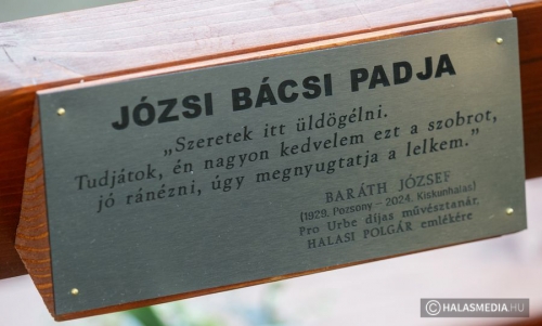 Az emlékpad avatáson az egyik kezdeményező, Király Gábor köszöntötte a jelenlévőket, majd Mester Sándor osztotta meg gondolatait. A tavaly ősszel elhunyt Baráth József tiszteletére megjelölt padon a tanár úr leánya Magdolna és Mester Sándor fémtáblát leplezett le. A táblán a következő felirat szerepel. JÓZSI BÁCSI PADJA „Szeretek itt üldögélni. Tudjátok, én nagyon kedvelem ezt a szobrot, jó ránézni, úgy megnyugtatja a lelkem." BARÁTH JÓZSEF (1929. Pozsony - 2024. Kiskunhalas), Pro Urbe díjas művésztanár HALASI POLGÁR emlékére.