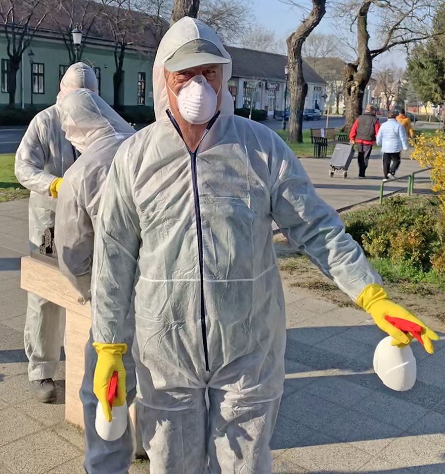 Szombat reggel fehér szigetelő, egész testet befedő kezeslábasban, maszkkal az arcukon, sárga gumikesztyűben végeztek fertőtlenítő munkát a városháza előtt emberek. A piacra tartók rácsodálkoztak a látványra, de mindenki továbbhaladt, intézve a hétvégi bevásárlást és az egyéb ügyes-bajos tennivalóikat. A tisztítást végző csoporttól megtudta szerkesztőségünk, hogy a közterek padjait fertőtlenítik és a Városgazda Zrt. munkatársai.