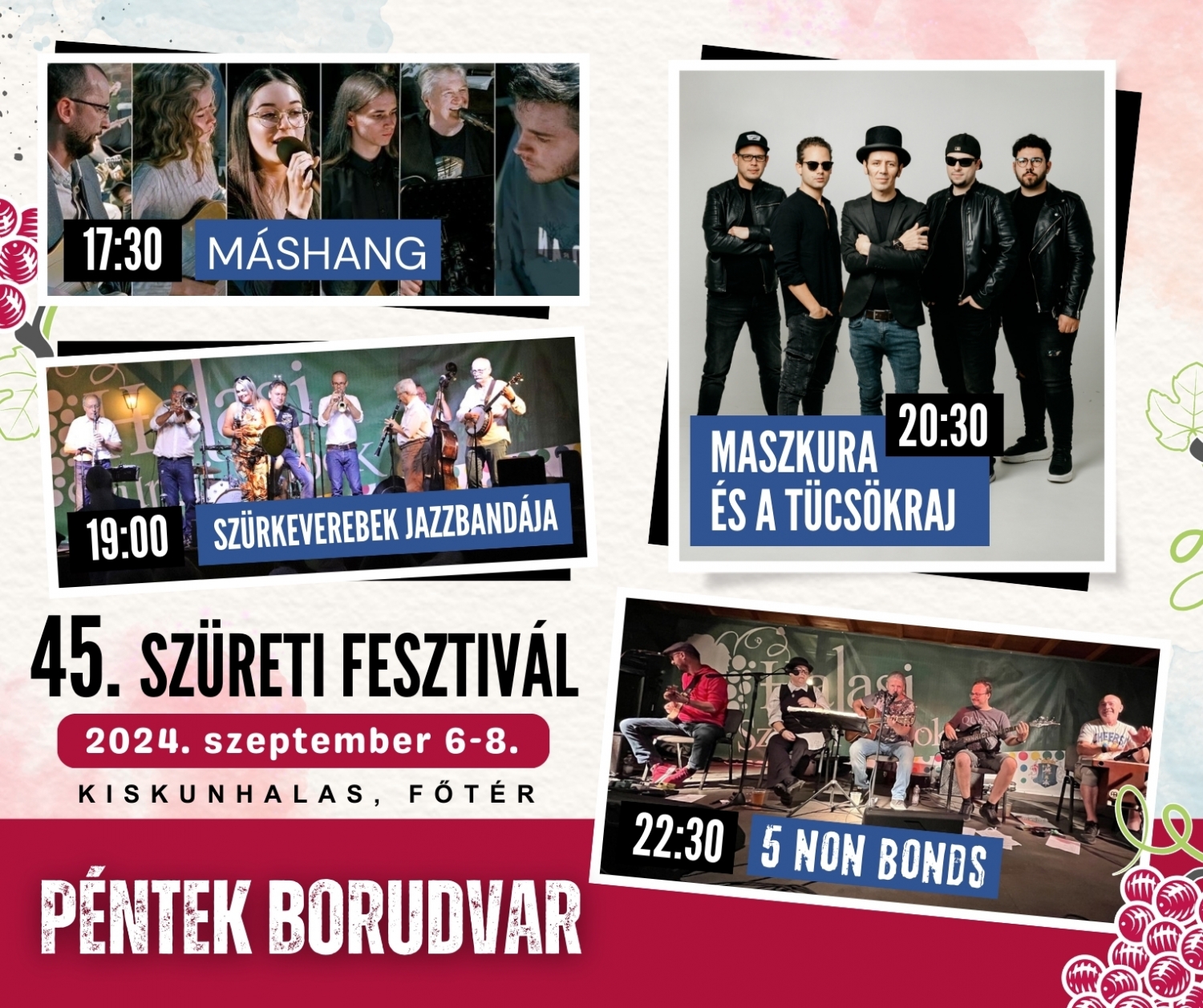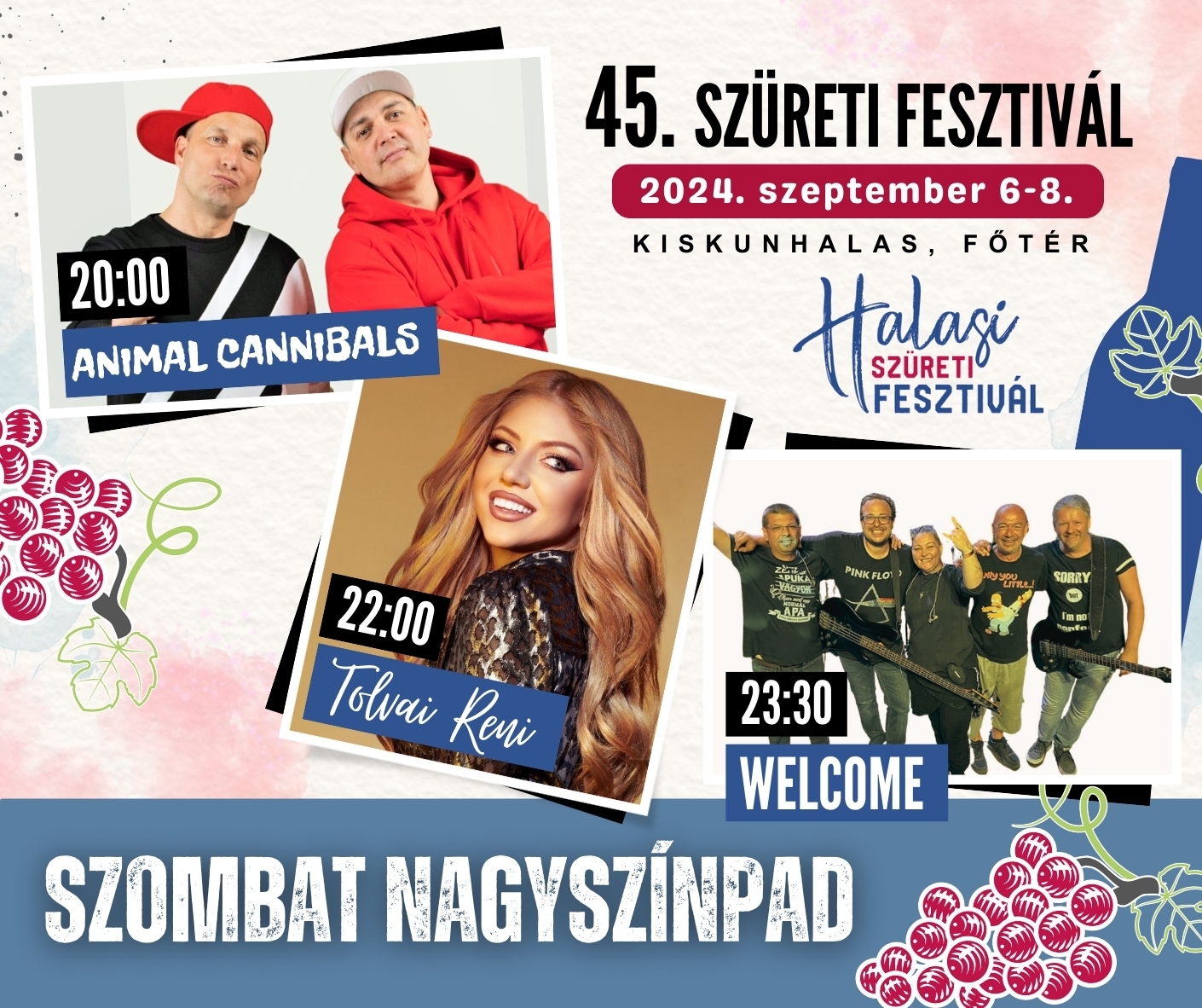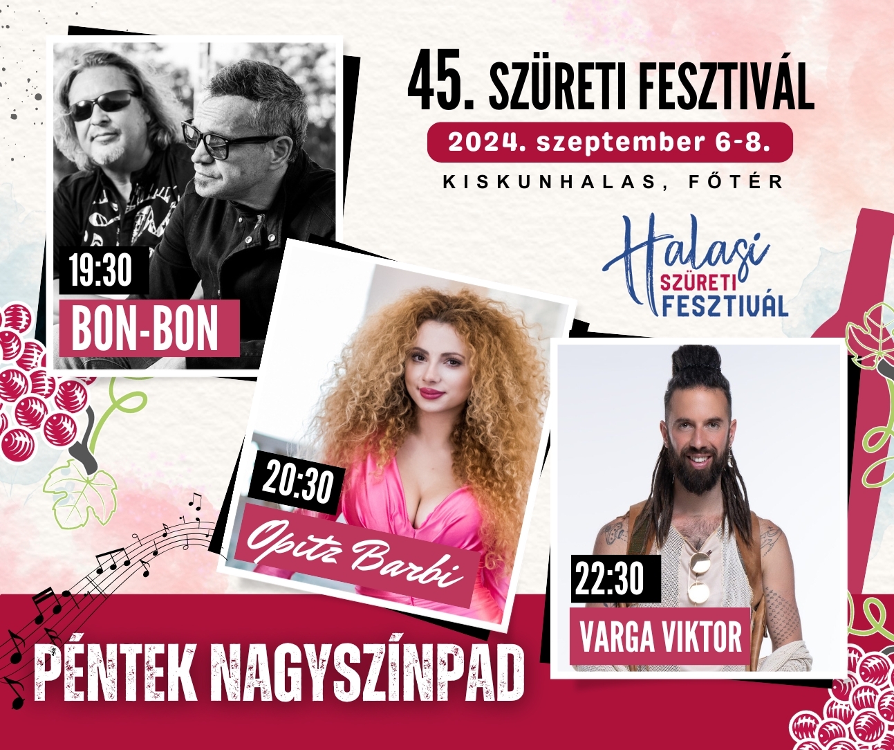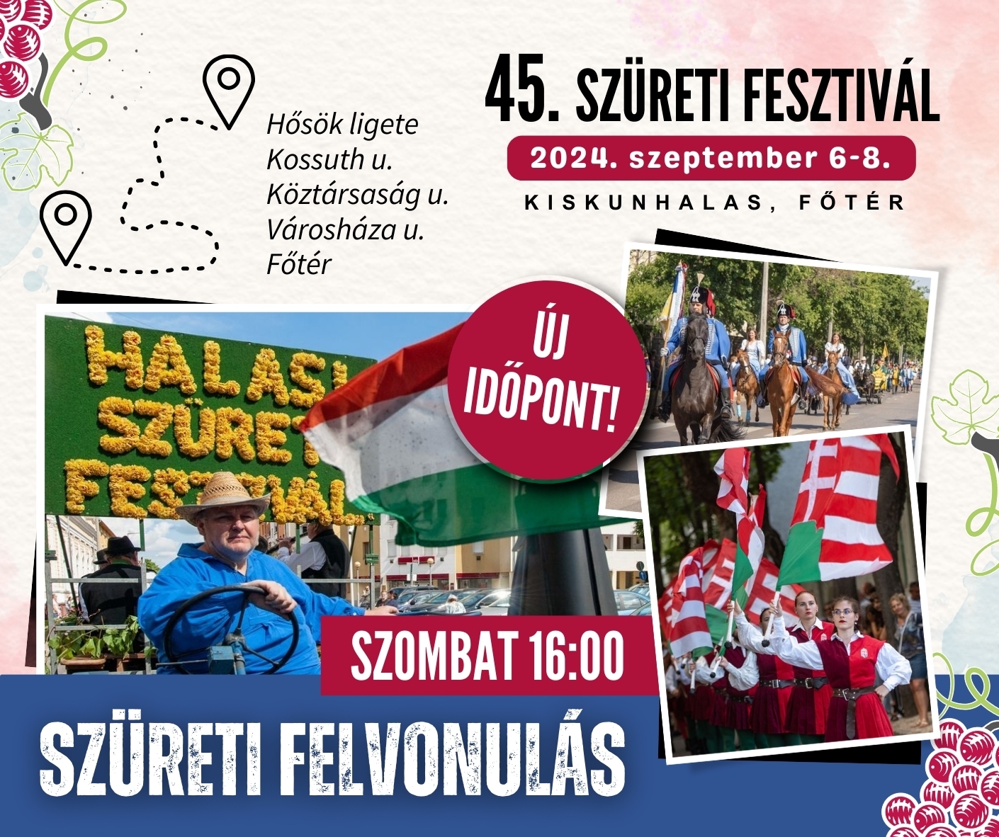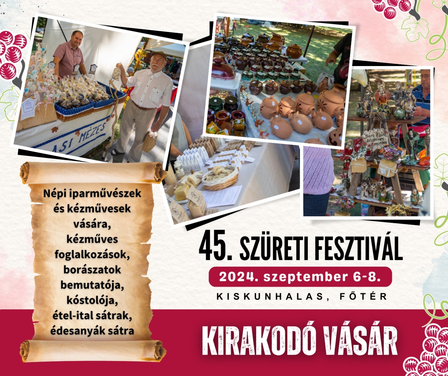 Koncertek, folklór program, felvonulás, borudvar, finom ételek, kirakodóvásár és gyermekjátszó vár kicsiket és nagyokat, helyi és térségbeli lakosokat, turistákat Kiskunhalas legnagyobb rendezvényére a 45. Kiskunhalasi Szüreti Fesztiválra szeptember 6. és 8. között.