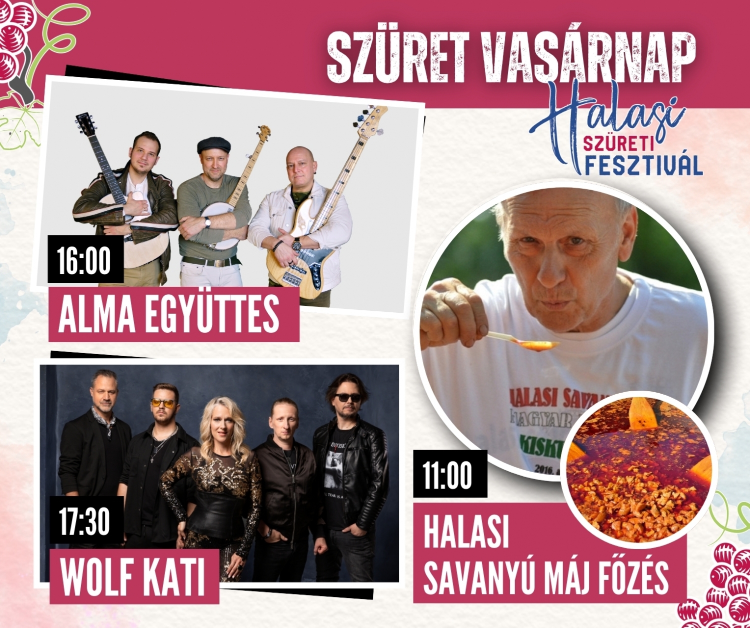 Fél 3-tól fitness és táncbemutatók szerepelnek a programban. A Halas Fitness Egyesület, a GrandUp táncosai lépnek fel. 16 órakor kezdődik az Alma együttes műsora és fél 6-tól Wolf Kati koncertje zárja a Halasi Szüreti Fesztivált.