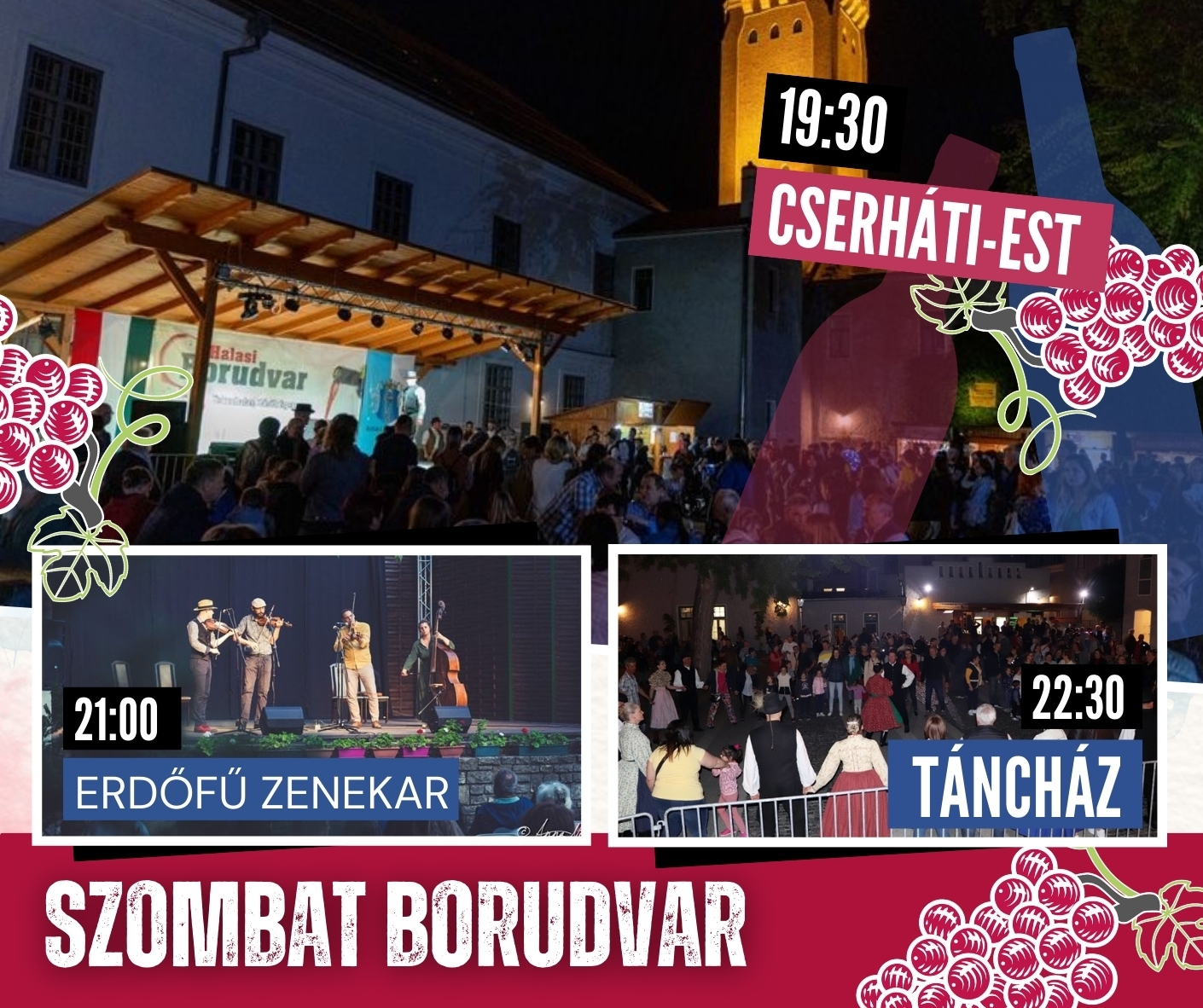 A borudvarban szombaton 18 órától a Brandy zenekar lép fel, fél 8-kor kezdődik a Cserháti-est, majd jön az Erdőfű zenekar és végül táncházzal zárul a program.