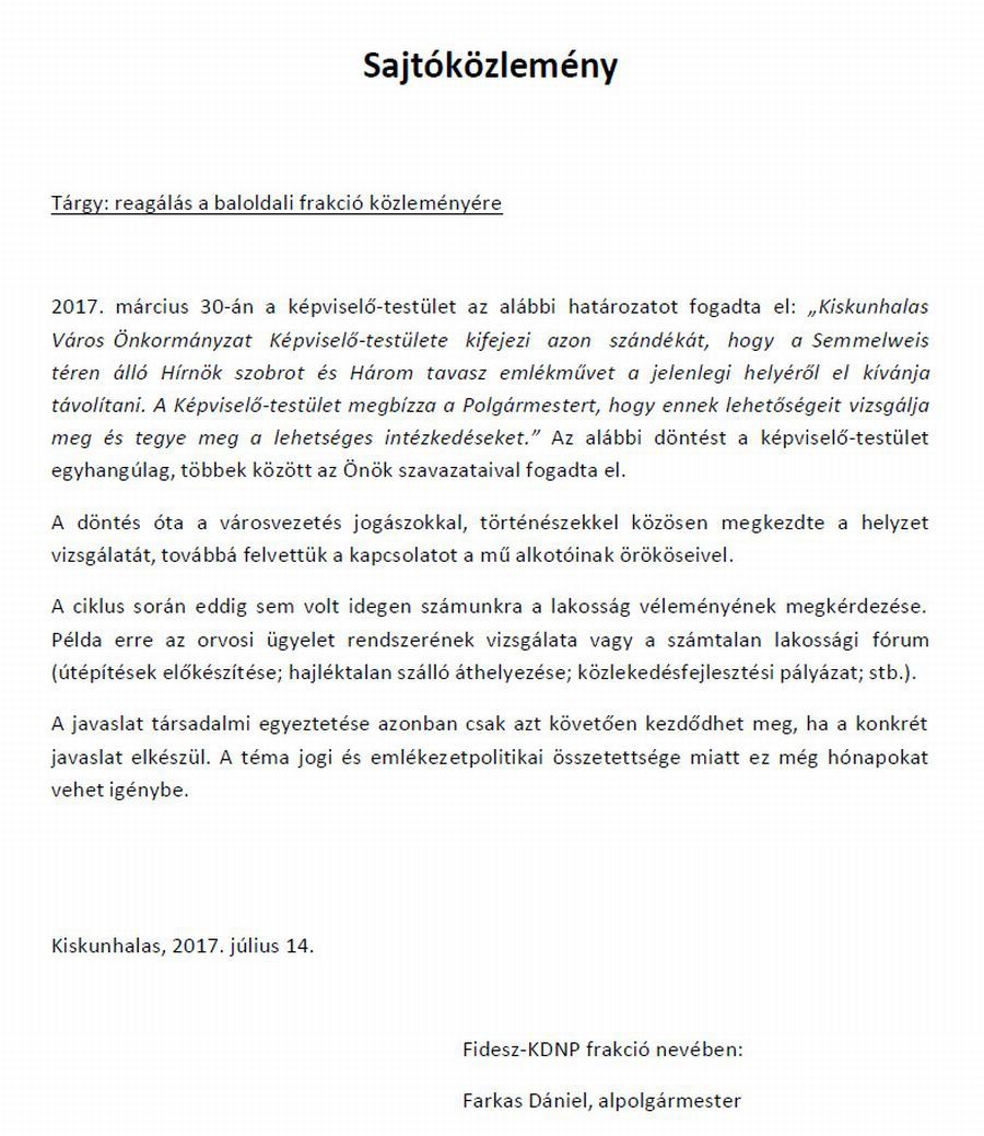 Farkas Dániel, Kiskunhalas város alpolgármestere, a Kiskunhalasi Fidesz-KDNP frakció nevében reagált a Sikeres Halasért Társaság (SHT) által kiadott, a Semmelweis téren álló Hírnök szobor és a Három tavasz emlékmű áthelyezésével kapcsolatos közleményre, amelyet az alábbiakban ad közre a Halasmédia hírportálja.