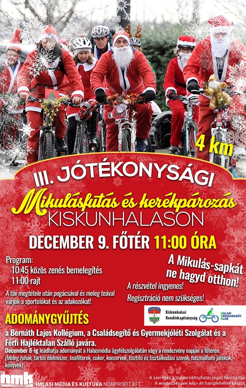 A Halasi Média és Kultúra Kft. harmadszorra szervezi meg a Jótékonysági Mikulásfutást és kerékpározást Kiskunhalason. December 9-én várnak minden sportolni vágyót a Bethlen Gábor térre, ahol 10:45-től közös zenés bemelegítéssel kezdődik a program.