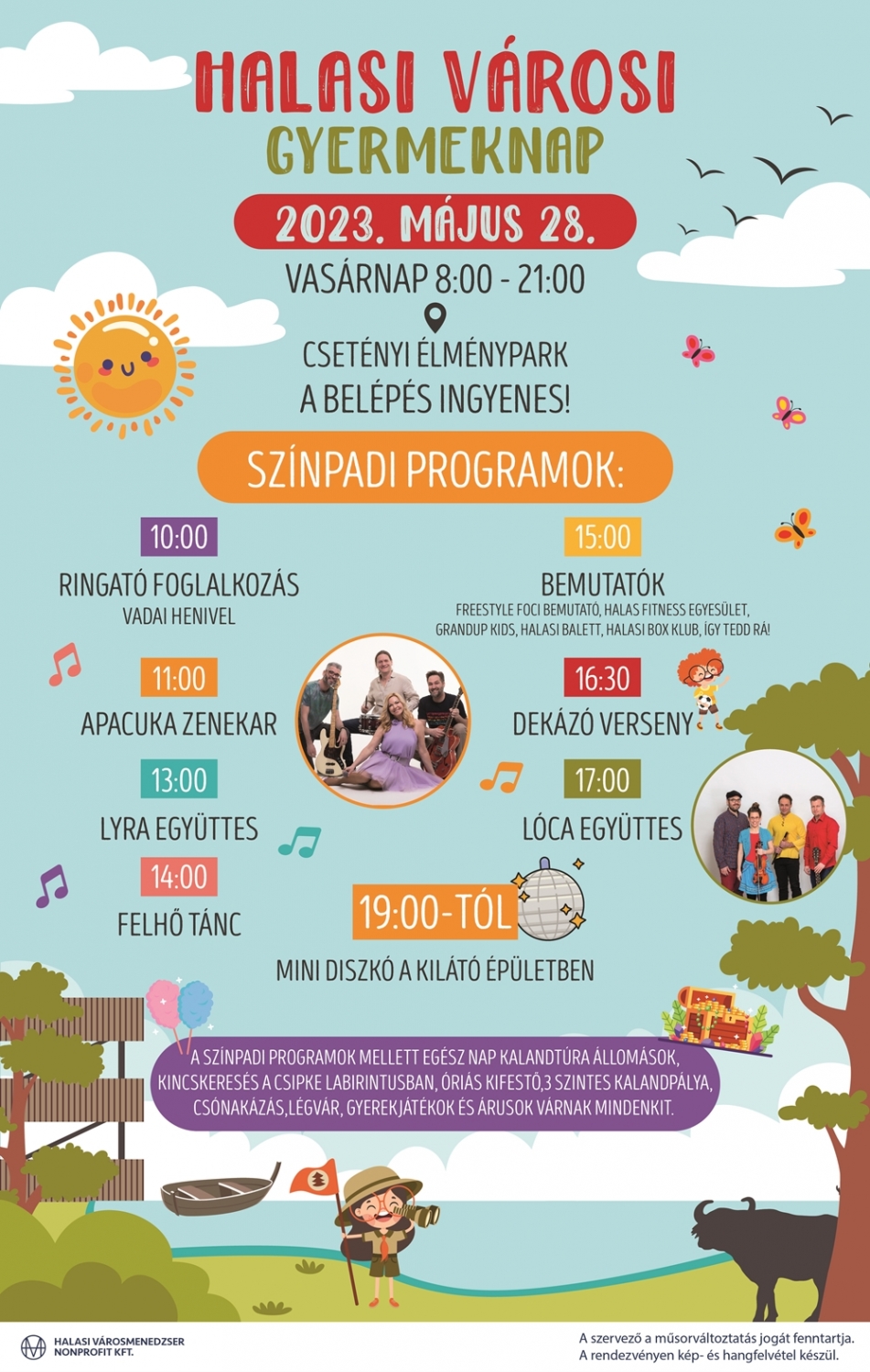 A családoknak érdemes már most bírni a naptárakba, hogy május 28-án rendezik meg a Városi Gyermeknapot a Csetényi Élményparkban, a Halasi Városmenedzser Kft. szervezésében. Reggel nyolc és este kilenc óra között színvonalas produkciók, koncertek, minidiszkó, kincskeresés és sok finomság várja a kisebbeket és nagyobbakat. A nap során közönség elé áll az Apacuka zenekar, a Lyra együttes, a Felhőtánc és a Lóca formáció is. A belépés mindenkinek ingyenes.