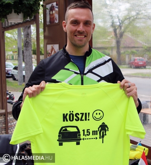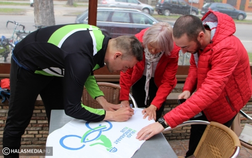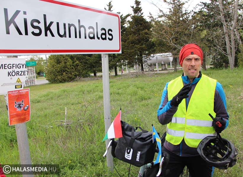 Kövesd az álmaid! Ez Lázár Valentin jelmondata azon a hosszú úton, amelyet saját maga számára jelölt ki. Nyugodtan nevezhetjük a 38 esztendős fiatalembert világvándornak. Évekkel ezelőtt végigutazta a transzszibéria vasútvonalat, most pedig két keréken járja az országutakat. Szereti a szabadságot, a kötetlenséget, a biciklizést. Kerékpárra pattant március elsején Stockholmban, hogy aztán hónapokkal később megérkezzen Teheránba, Irán fővárosába. Eddig 1800 kilométert tett meg, szombaton a Halasi Bringabarát Klub vendége volt. Koch Edit, Vörös Tamás, és Király Gábor társaságában a várostáblánál fogadtuk a Kiskunmajsa felől érkező Valentint.