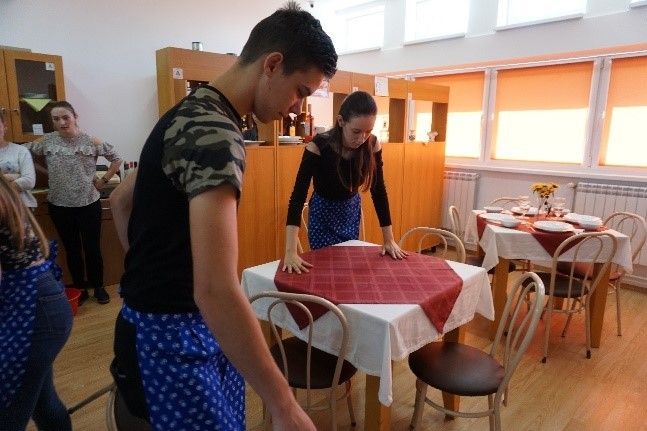 Székelyudvarhelyen a két iskola diákjainak közös szakmai programján kellemes időt tölthettek el. Programok része volt: díszasztal készítés, csomagolóverseny, krumplipucoló verseny, pincér gyorsasági verseny. Majd sor került iskolánk diákjai által készített eszközök, tárgyak átadására. Gyergyóújfalun megismerkedtek táncház keretében a hasonló életkorú diákokkal közösen a helyi néphagyományokkal, népviselettel, néptáncokkal.
