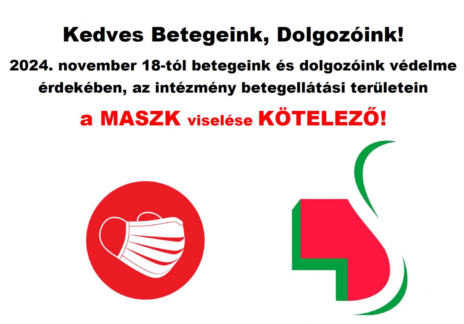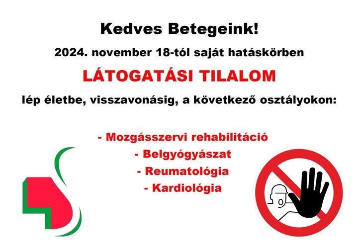 A Kiskunhalasi Semmelweis Kórház a Szegedi Tudományegyetem Oktató Kórháza saját hatáskörben látogatási tilalmat rendelt el 2024. november 18-tól (hétfőtől) a mozgásszervi rehabilitációs, a belgyógyászati, a reumatológiai és kardiológiai osztályokon. A rendelkezés visszavonásig érvényes. Ugyancsak november 18-tól a betegek és a dolgozók védelme érdekében az intézmény betegellátási területein a maszk viselése kötelező – tájékoztatott közösségi oldalán a kórház.