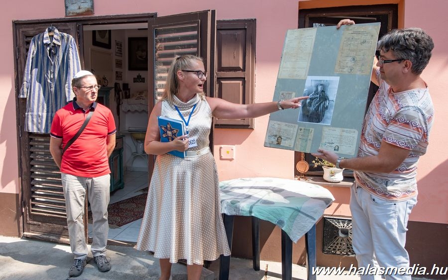 A párbeszédet követően Róna Tamás főrabbi megfújta a sofárt (ősi zsidó fúvós hangszer, kosszarv), majd kezdetét vette Oláh Adrián és Bakos Ágnes vezetésével a kiskunhalasi zsidó helytörténeti gyűjtemény bemutatása. Az egykori rabbi lakban berendezett kiállításon zsidó háztartási használati eszközöket, és eredeti - még nem látott- a holokauszt időszakához kapcsolódó tárgyakat lehetett megtekinteni. Ilyen többek között, egy eredeti, a II. VH idején a zsidók ruháján kötelezően viselt sárgacsillag mellet, az Európában is ritkaságszámba menő munkatábori rabruha. A szürke, kékcsíkos, nyers szövetből készült rabruhát a Kiskunhalason élő, 98 esztendős, Krausz Dezsőné (Bakos Ágnes nagymamája) eddig a szekrénye mélyén őrzött, és most a kiállításra átadott. Krausz Dezsőné visszaemlékezéseit a Halas Televízió rögzítette korábban, és idekattintva megnézhetik olvasóink!