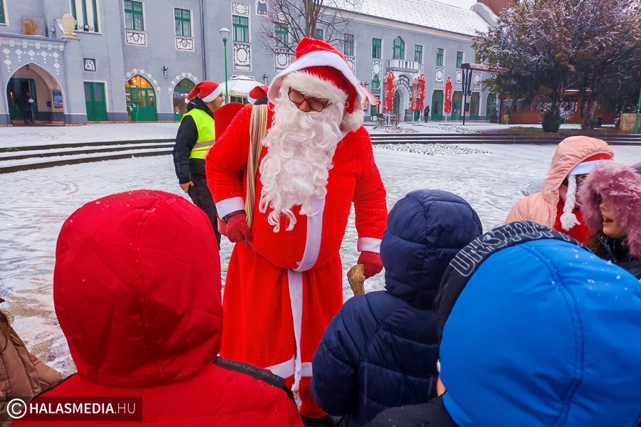 A hófehérbe öltözött halasi városközpontban több óvodás és iskolai csoport is megállt néhány percre, hogy a kicsik hógolyózhassanak egy keveset. Ott jártunkkor, még maga, a nagyszakállú Télapó is megjelent a Bethlen Gábor téren, hogy megajándékozza a gyerekeket.