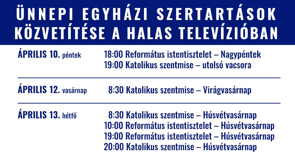 Idén a húsvéti egyházi események a koronavírus-veszély miatt a templomokban, imaházakban zárt ajtók mögött zajlanak. A szertartásokat a legtöbb helyen online, a közösségi oldalak segítségével juttatják el az egyházközségek a hívőkhöz. A Halas Televízió is több szertartást műsorra tűz az elkövetkező napokban. 10-én, pénteken 18 órakor Református istentisztelet, 19 órakor katolikus szentmise lesz látható. Vasárnap délelőtt fél 9-től láthatnak egyházi szertartásokat a Halas Televízióban. Húsvét hétfőn pedig délelőtt és az esti órákban is. A misék és istentiszteletek kezdési időpontjait az alábbi plakáton olvashatják.