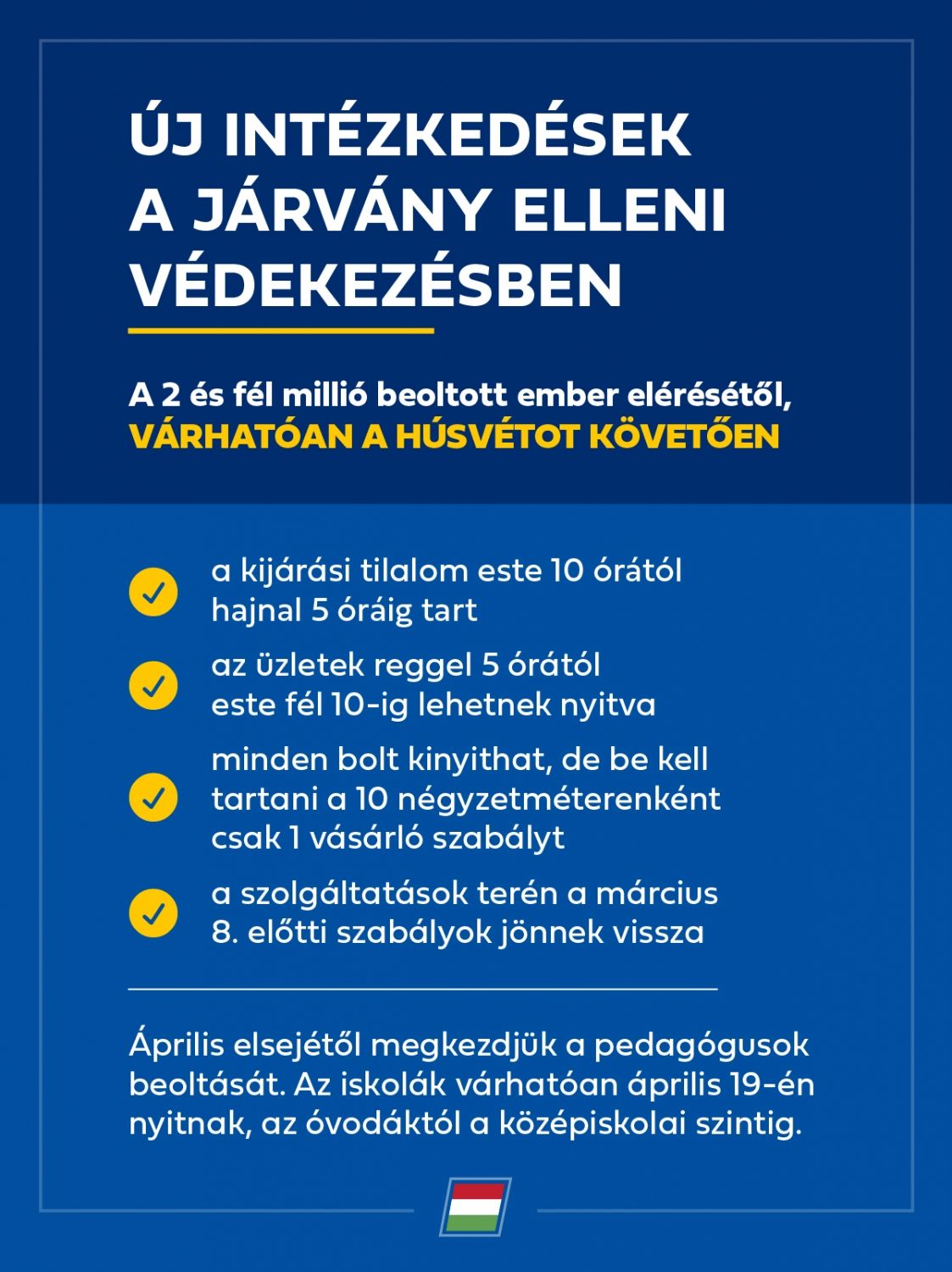 Változtatásra akkor van lehetőség, ha átlépjük a 2,5 millió beoltottat. Ez a jelenlegi számítások szerint húsvét hétfő után lesz pár nappal. Amikor ez megtörténik, akkor a kijárási tilalom 22 órára módosul és hajnali 5-ig tart, az üzletek reggel 5-től este fél 10-ig lehetnek nyitva, valamennyi bolt kinyithat, de 10 négyzetméterenként csak egy vásárló tartózkodhat bent.