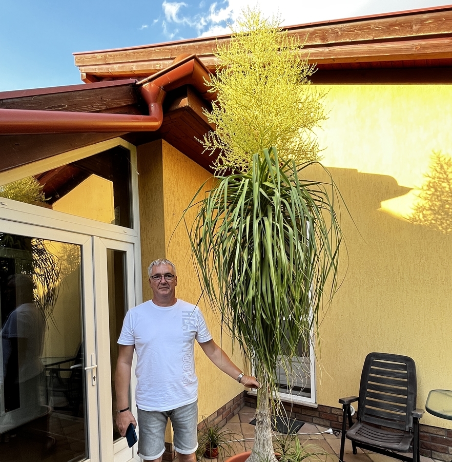 Nagyon készülnek a Szathmáry Sándor Kertbarát Egyesület tagjai a hagyományos terménybemutatójukra. Hosszú évek óta elmaradhatatlan kísérőprogramja ez a Halasi Szüreti Fesztiválnak. A Művelődési Ház udvara ilyenkor oázissá változik, és szebbnél-szebb zöldésgeket, gyümölcsöket lehet megcsodálni. Látszik, hogy az egyesület tagjai szívvel, lélekkel gondozzák a kertjeiket. Idén egy különleges növényt is meg lehet tekinteni, amelyet Soós Róbert nevelget több mint egy évtizede. - Ez a buzogányfa vagy elefántláb. Azt írja a szakirodalom, hogy 10-15 évet el kell érni a növénynek a virágzás esetleges kialakulasához. A szóban forgó növény kb. 12 éve van nálam, így még nagyobb büszkeség, hogy nálam virágzott ki először - tudtuk meg a büszke tulajdonostól.