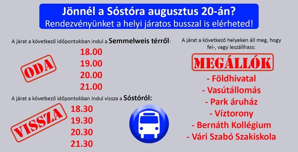 Gondolva azokra, akiknek nincs autójuk vagy nehezebben mozognak, így kerékpárral sem tudnak kijutni a helyszínre, a Halas Busz Kft. augusztus 20-án ingyenes buszjáratot indít a városközpont és a Sóstó között. A járat 18 órától az igényeknek megfelelő időtartamban áll az ünneplők rendelkezésére.