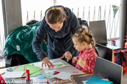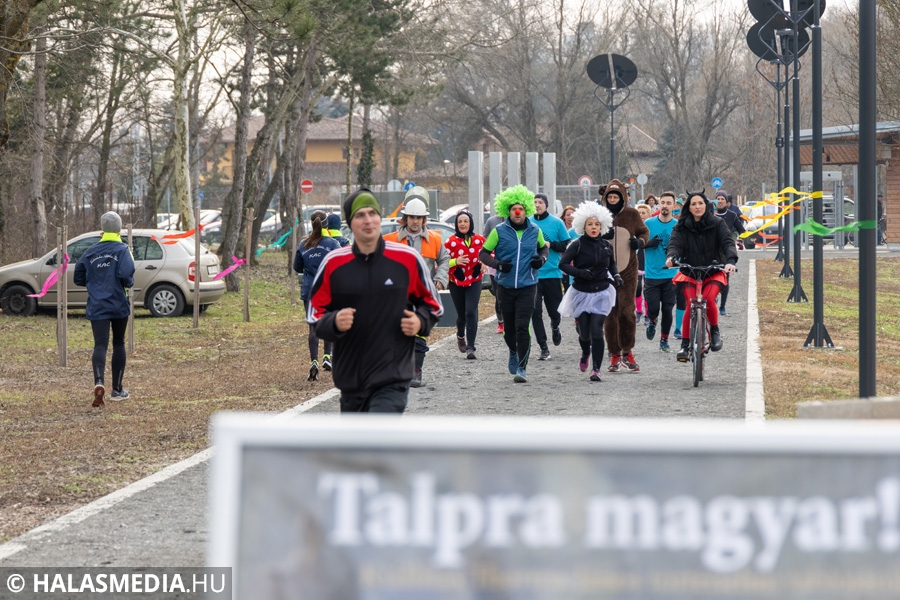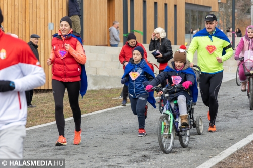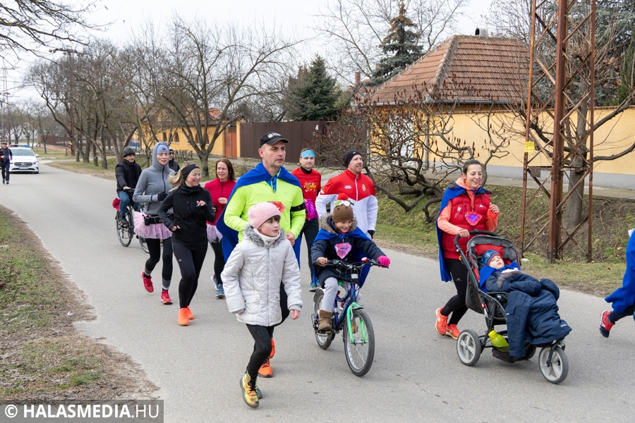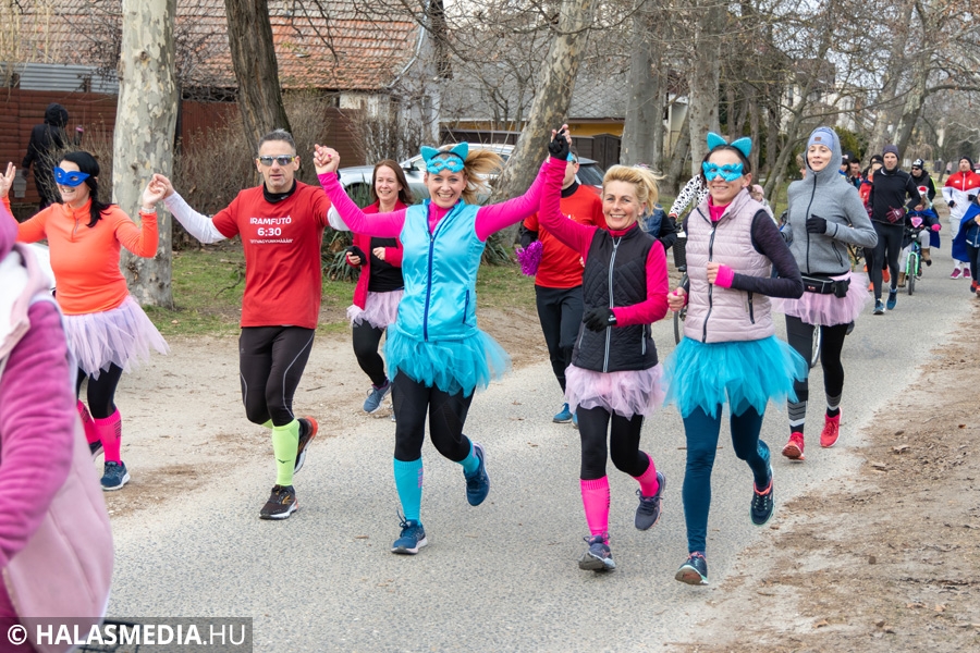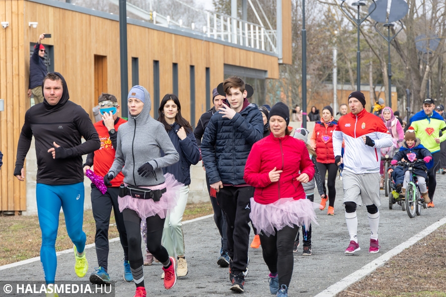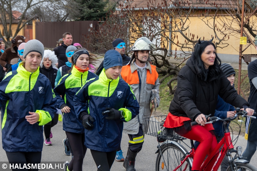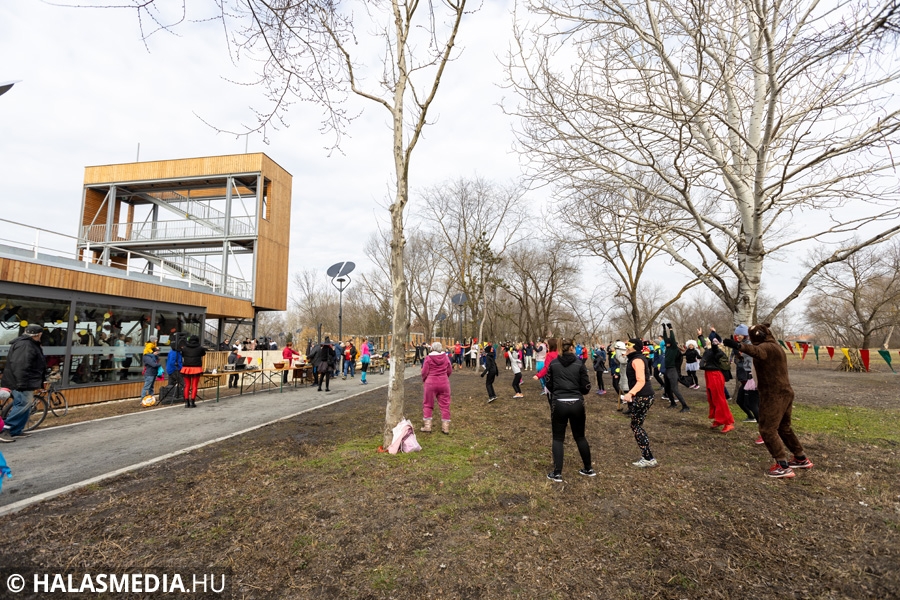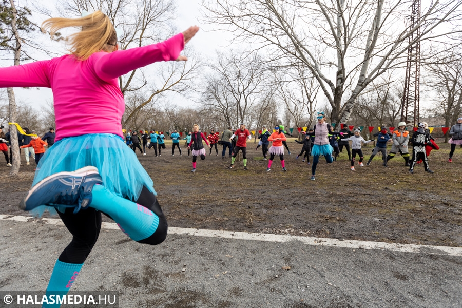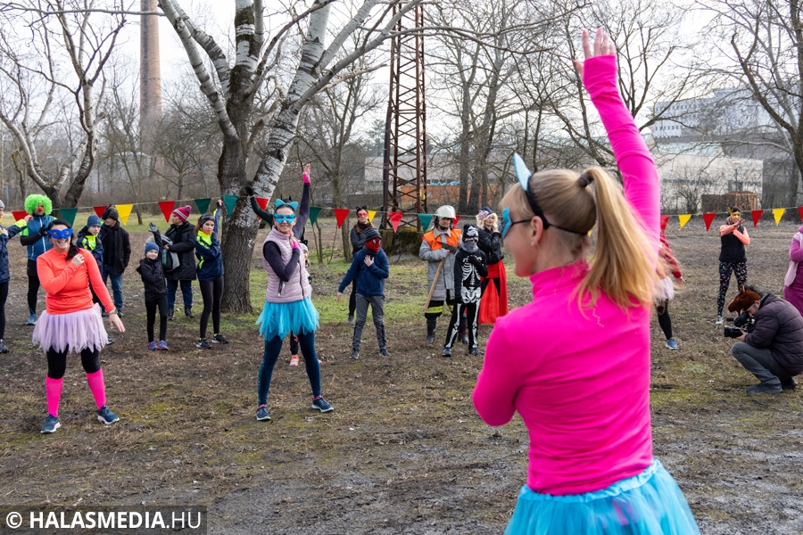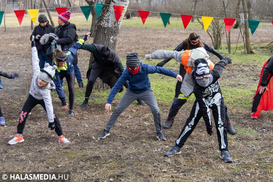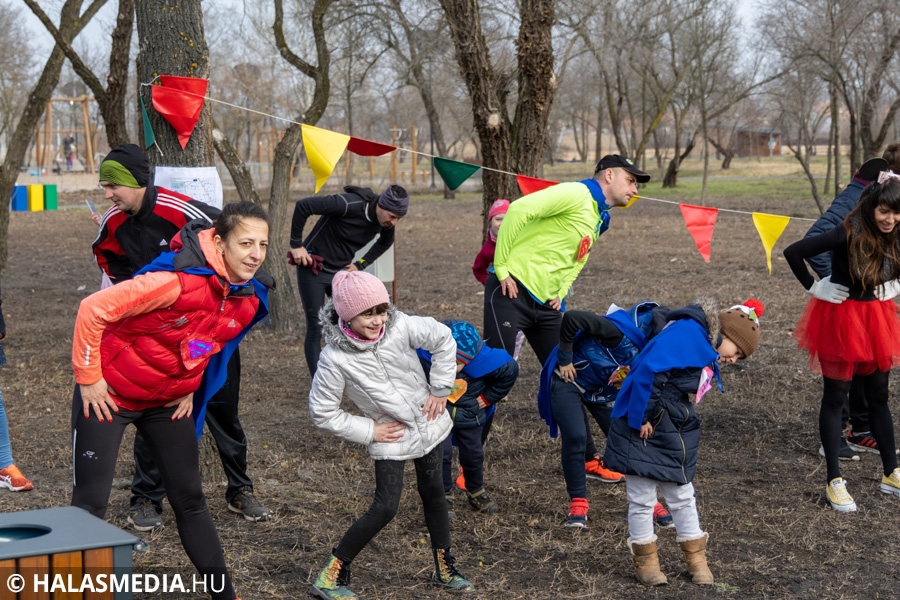 Míg bent a kicsik a Fészekrakó Nagycsaládosok Egyesülete jóvoltából kézműveskedhettek, kint a jelmezbe öltözött futók közös, zenés bemelegítéssel készültek fel a 11 órakor elrajtoló négy kilométeres táv megtételére. Kicsik és nagyok együtt tornáztak a februári napsütésben.