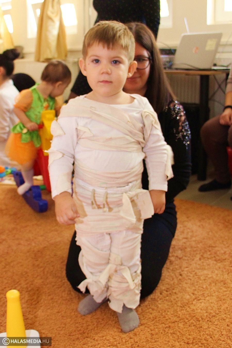 - Szeretünk ebbe a babaklubba járni. A kicsiknek jó, ha közösségben vannak, mivel a legtöbb kisgyerek egész nap az anyukájával van otthon, ilyenkor pedig tudnak másokkal is találkozni. A szülőknek is jó, hogy tapasztalatot tudnak cserélni, meg lehet beszélni a mindennapos problémákat, tanácsokat adhatunk egymásnak. A mostani rendezvényt is jó ötletnek tartom, bár személy szerint én a halloweent nem kedvelem, de megoldottuk a dolgot. Őszi farsangnak nevezzük, ugyanúgy jelmezt öltünk, így a gyermekünk sem marad ki semmiből – nyilatkozta Szűcs Éva.