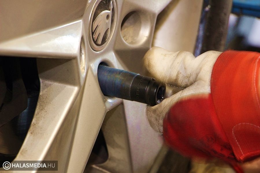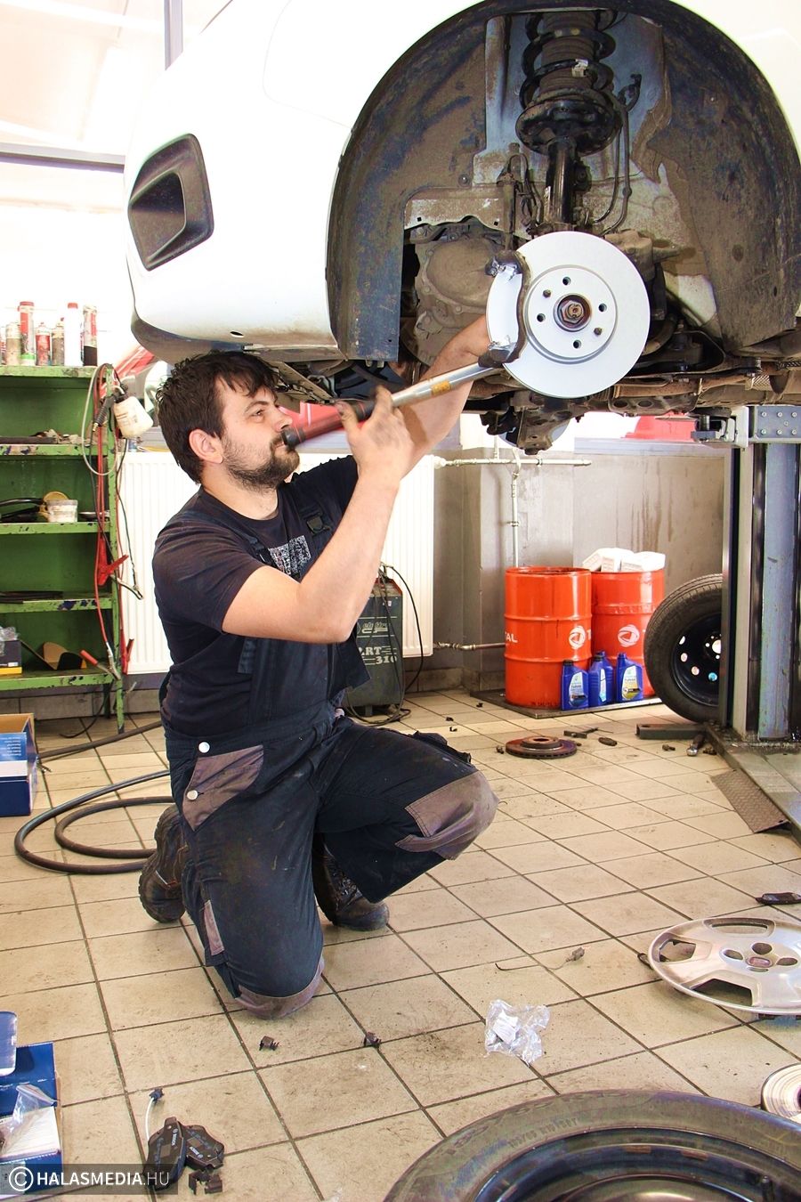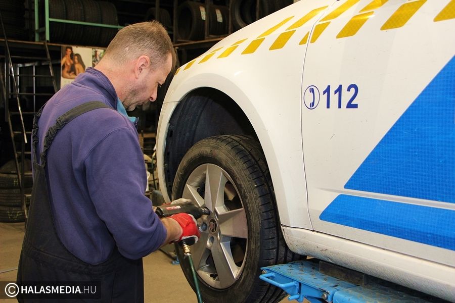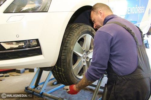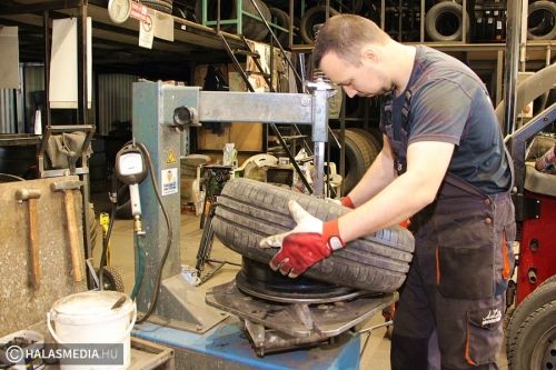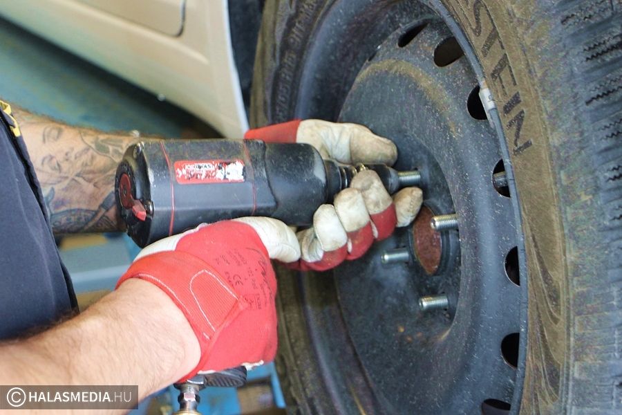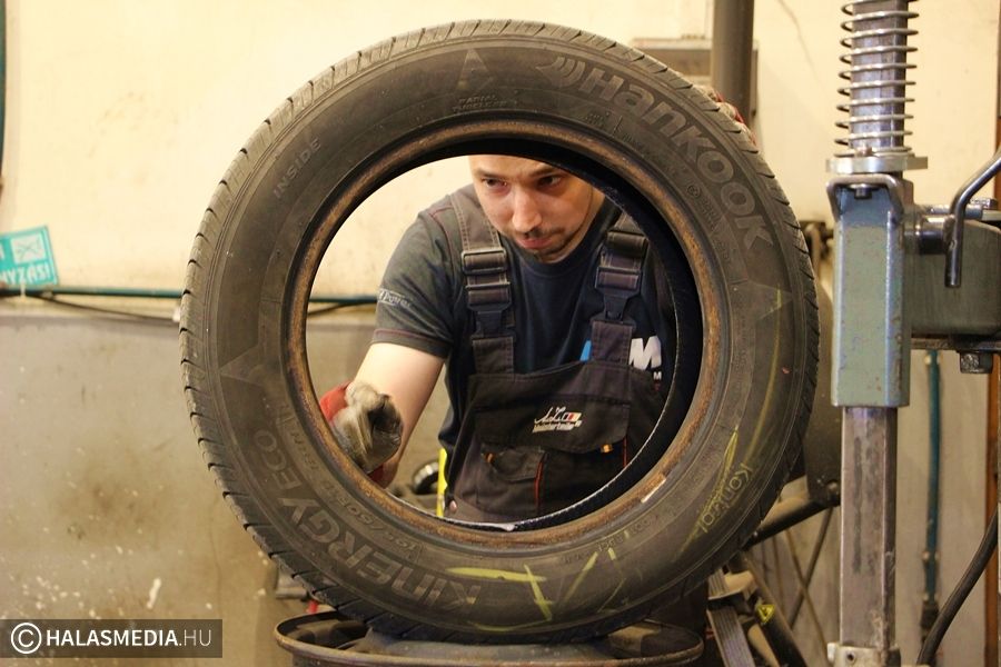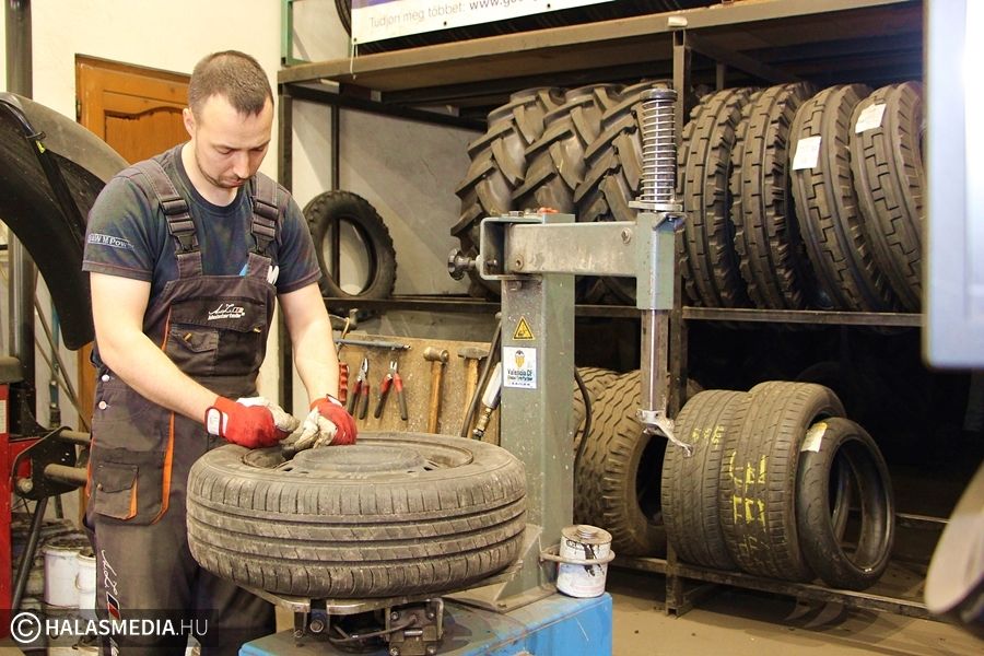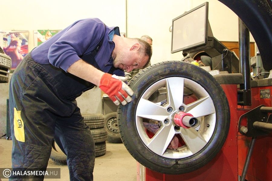 Sorra érkeznek gumicserére az autók ebbe a kiskunhalasi szervizbe. Az autósok többsége a jó idő beköszöntével igyekszik mihamarabb megejteni az abroncsok cseréjét.