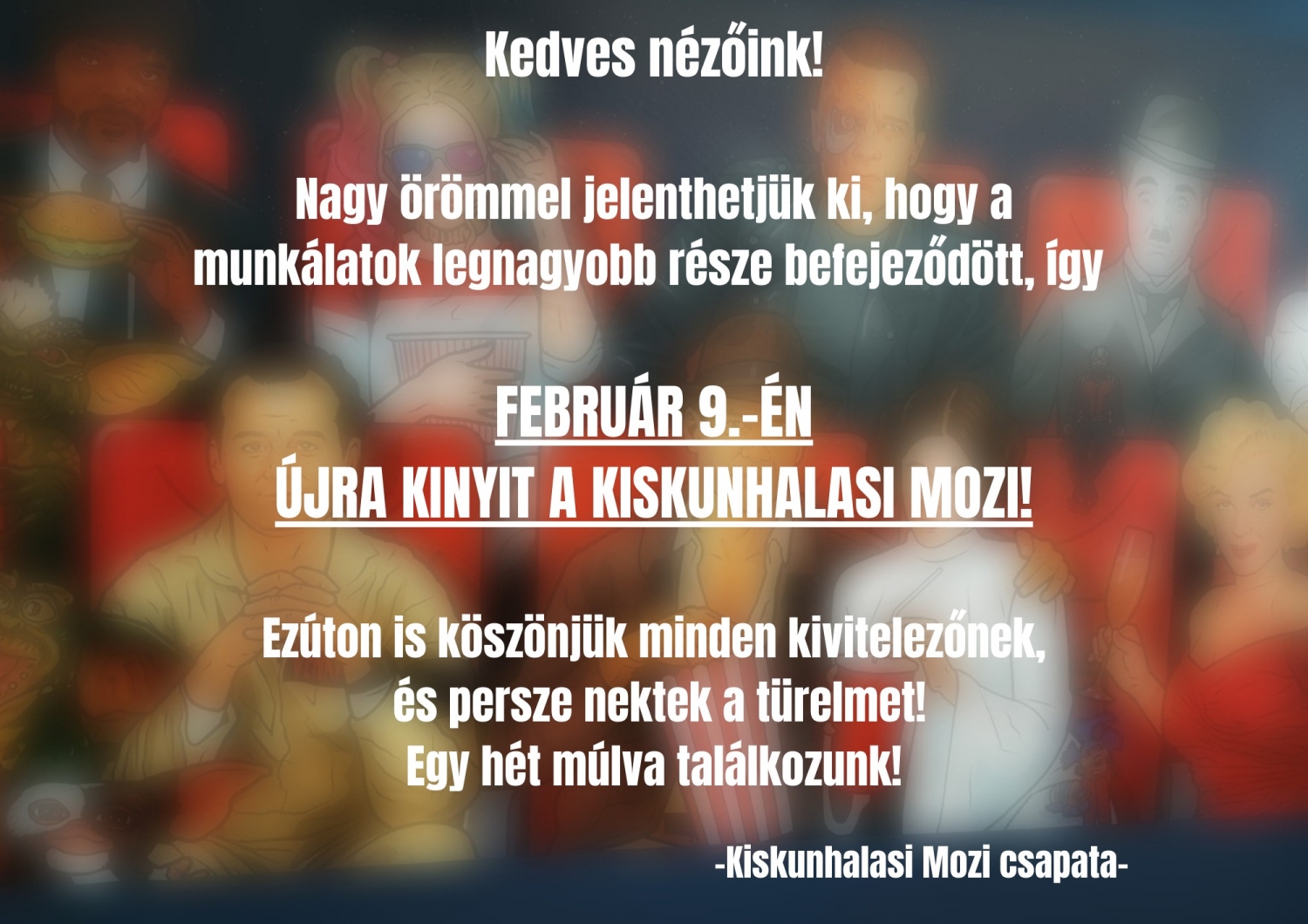 A filmszínház február 9-én, vagyis éppen egy hónappal az ideiglenes bezárást követően nyitja meg kapuit az érdeklődők előtt. A hivatalos közlemény az alábbiakban olvasható.