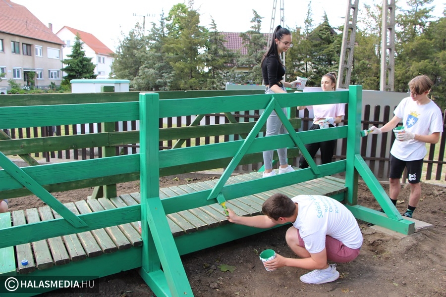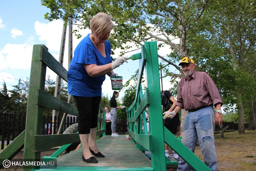 - Megújítása szükséges volt, egyesületünk gondot fordít a fenntarthatóságra, az általunk létrehozott értékek védelmére. A tervezetthez képest nagyobb felújításra volt szükség, egy hídpillérrel többet kellett kicserélni. Ehhez segítségként faanyagot kaptunk Paprika Károly vállalkozótól, a munkálatokat pedig Fekete Sándor asztalosmester és kollégái végezték el. Mindkét támogatónknak hálásan köszönjük az önzetlenségét. A híd színe élénkebb lett, jól harmonizál a vidám óvodai élettel. A festéket Dózsa Tamás Károly egyesületi tagunk ajánlotta fel, aki méhészként a kaptárakat festette ezzel az árnyalattal, így „kaptárzöld” színben pompázik a megújult hidunk. A festésben a Szilády Áron Református Gimnázium 10. a osztályának diákjai és osztályfőnökük, Palásti Károly tanár úr, egyesületünk alelnöke vett részt. Hálás köszönet a diákoknak, hogy - közösségi szolgálat keretében – szorgalmasan dolgoztak és alelnökünknek, hogy a korábbi esős nap nem szegte kedvüket. Újra és gyorsan megszervezték a közös festő napot. A munkadélután nagyon kellemes hangulatban telt el, a jól végzett munka örömével indult haza mindenki.