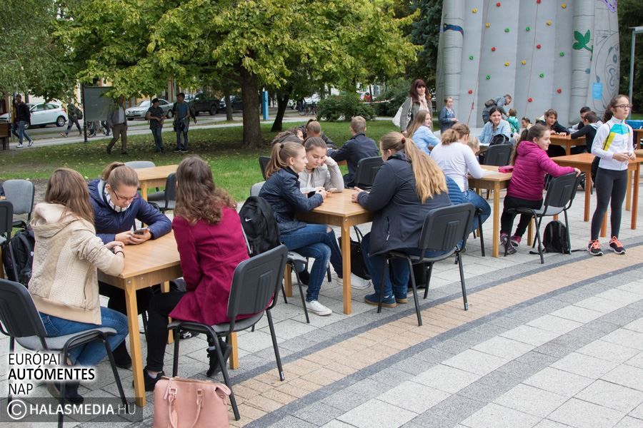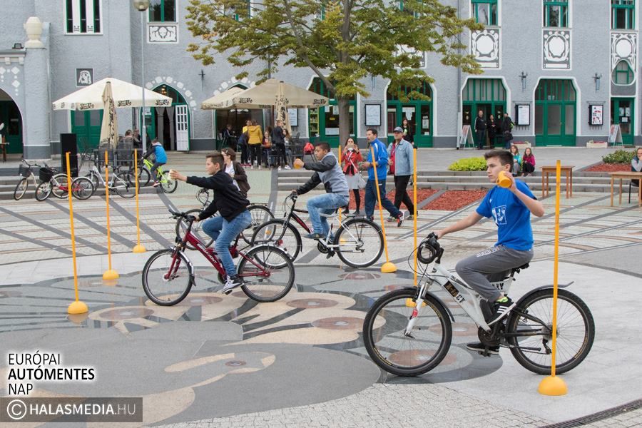 Az Európai Autómentes Nap péntek délután is tartogatott élményeket a Halas főterére látogatóknak. Sorra érkeztek a kerékpárosok. Az iskolák csapatai mérték össze ügyességüket, kerékpáros jártasságukat.