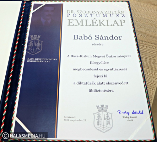Városunkból ketten érdemelték ki a dr. Szobonya Zoltán Posztumusz Emléklapot. Babó Sándort 1948-ban tartóztatták le a Független Kisgazdapárt iratainak ellopásáért. Vallatták és kegyetlenül összeverték. Családja Harkakötönyben rengeteg földdel rendelkezett, de az ötvenes években kulákká nyilvánították őket. A teljes vagyonelkobzás mellett szükséglakásba kényszerítették őket. Sándor huzamosabb munkakeresés után vasúti munkás, majd mozdonyvezető lett. Az emléklapot özvegye vette át Fülöp Róbert polgármestertől (címképünkön).