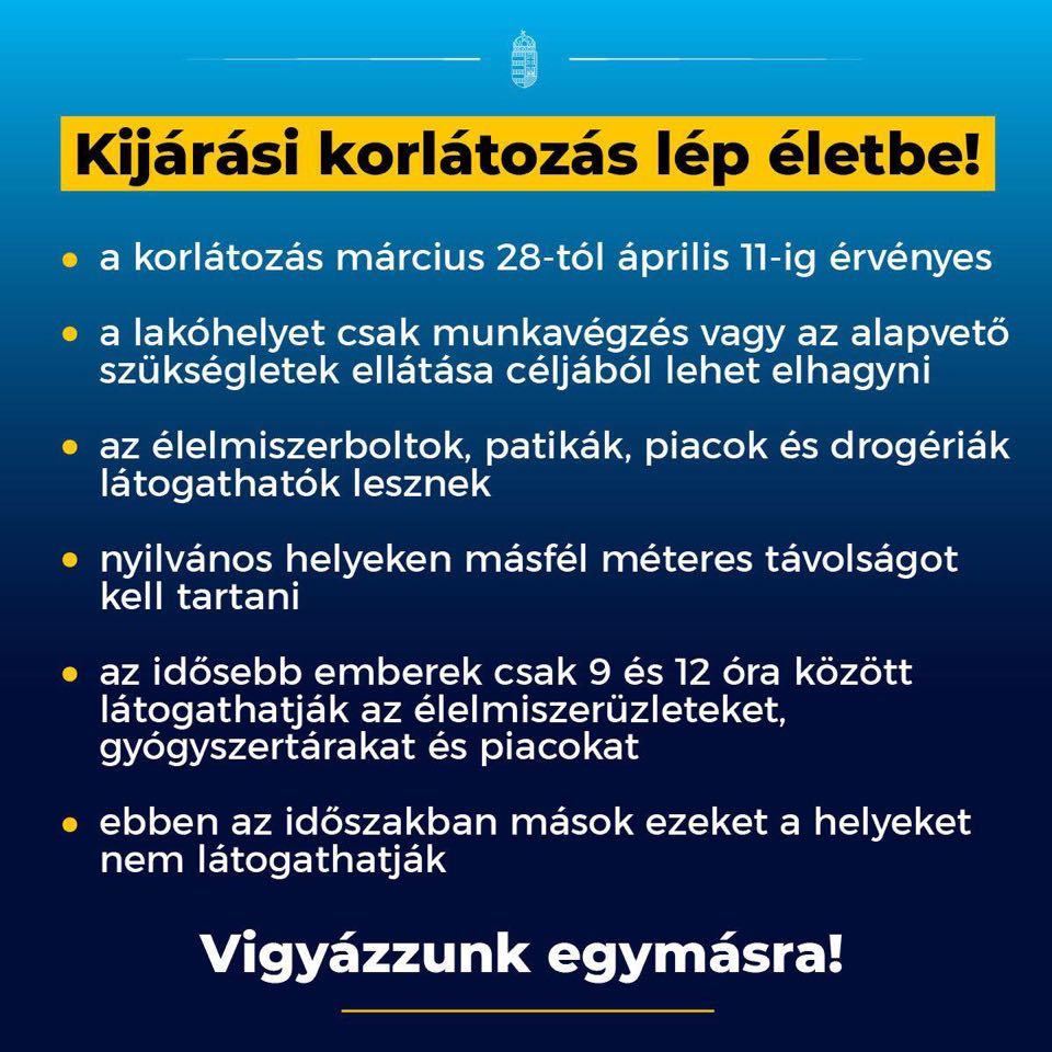 Kijárási korlátozást vezetnek be Magyarország egész területére március 28. és április 11. között. Két héten keresztül az otthonunkat vagy a lakóhelyünket csak munkavégzés vagy az alapvető szükségletek ellátása céljából hagyhatjuk el - jelentette be Orbán Viktor miniszterelnök pénteken a Kossuth rádió Jó reggelt, Magyarország! című műsorában- jelentette a Magyar Távirati Iroda.