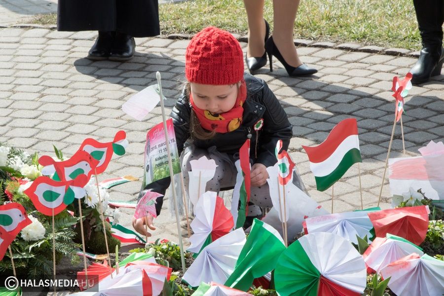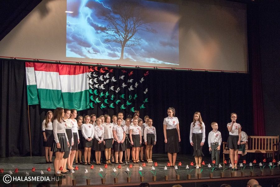 A városi ünnepség következő állomása a Petőfi szobornál volt. Halason már évek óta hagyomány a Talpra Halas, vagyis a Nemzeti dal közös elszavalása. Törteli Dórának a Kertvárosi általános iskola 8. osztályos tanulójának a vezetésével hangzottak fel a jól ismert verssorok. A közös szavalásban idén is több százan vettek részt.