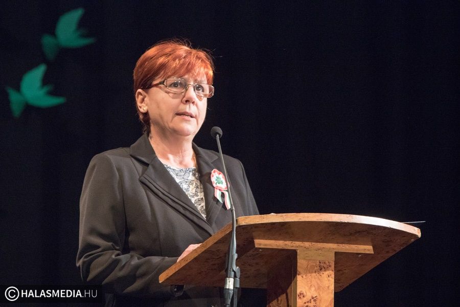 A zászlófelvonást követően a filmszínházba vonult át az ünneplő tömeg. Itt Laskovicsné Terzics Edit önkormányzati képviselő, a Kiskunhalasi Kertvárosi Általános Iskola igazgatója mondott ünnepi beszédet. Beszédében kitért arra, hogy kinek mit jelent március 15. de szólt a forradalom és szabadságharc mai üzenetéről is.