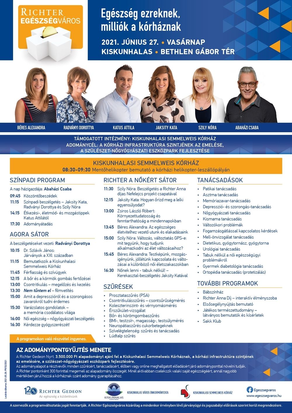 Katus Attila és Béres Alexandra például egészséges életmóddal kapcsolatos tippeket adnak, Jaksity Kata és Szily Nóra pedig motivációs és pszichológiai témákban adnak elő. A kiskunhalasi Richter Egészségvároson szintén részt vesz Dr. Szlávik János infektológus szakorvos is, aki 10.15-től az Agora sátorban tart előadást „Járványok a XXI. században” címmel.