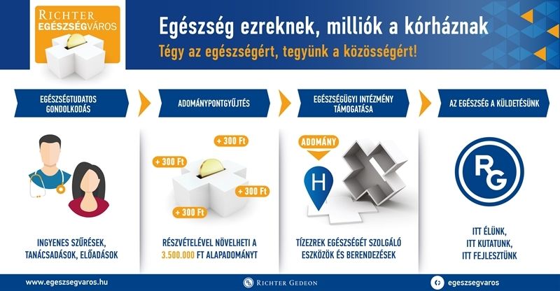 A magyar gyógyszergyártó vállalat megemelt összegű, 3,5 millió forintos alaptámogatásban részesíti a Kiskunhalasi Semmelweis Kórházat. Ezt az összeget a helyi lakosok tovább növelhetik, ugyanis a programokon, szűréseken, tanácsadásokon való részvételükkel adománypontokat gyűjtenek, melyek pontonként 300 forinttal növelik az adományalapot.