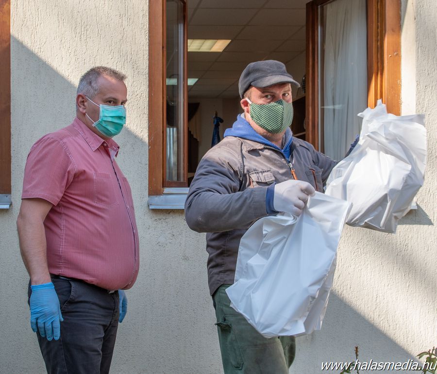 A polgármester és munkatársai a hivatal tanácskozó termében védőfelszerelésben állították össze az egységcsomagokat és adták át a Fehértó Nonprofit Kft. szállító dolgozóinak. A kollégák most éppen külterületre viszik ki a cég járművein az egységcsomagokat - mondta Huszár Zoltán. Száztizenhat csomagot juttatnak ki a megadott külterületi címekre és a műanyag tasakokat a kerítésekre akasztják.
