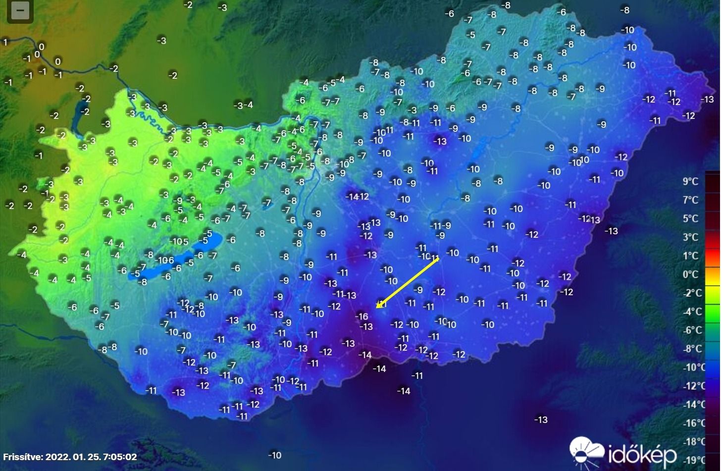 Az időkép.hu meteorológiai weboldal hőtérképe szerint, január 25-én reggel, Halashoz hasonlóan az ország több pontján is -16, -17 Celsius fokot mutattak a hőmérők. Városunkban a nyári hónapokban dőlt már meg országos melegrekord, ma reggel viszont csak néhány tized fokon múlt, hogy ne a miénk legyen a leghidegebb település.