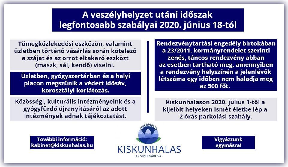 Csütörtökötől megszűnik az idősek vásárlási idősávja, viszont a maszkhasználat továbbra is érvényben marad. Többek között erről beszélt Gulyás Gergely a Miniszterelnökséget vezető miniszter sajtótájékoztatóján. Fontos szabály még, hogy megtarthatóak azok a zenés, táncos rendezvények, amelyen a nézői létszám nem éri el egyidőben az 500 főt. Kiskunhalason július 1-től ismét életbe lép a 2 órás parkolási limit. A fontos tudnivalókról Fülöp Róbert polgármester közzétett egy táblázatot.