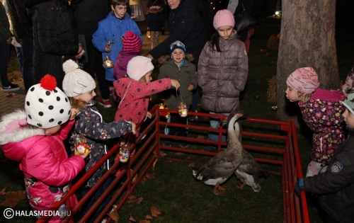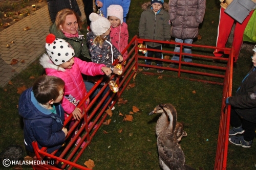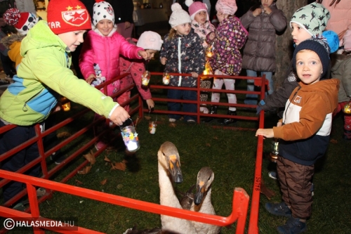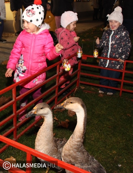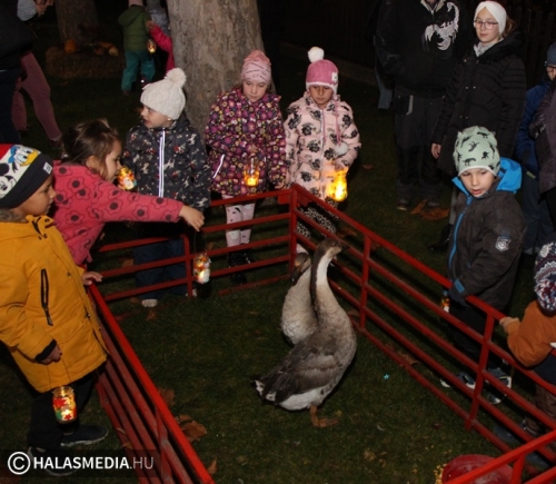Izgalmasan telt a közös lámpáskészítés, de mindenki nagyon várta azt a pillanatot, amikor ki lehetett menni az udvarra. Ott Minorics Lacika és szülei jóvoltából két liba várta az ovisokat. A lámpások fénye mellett lehetett etetni a szárnyasokat, a bátrabbak megpróbálták megsimogatni a jókora zsivajt is kiválóan tűrő jószágokat. Györgyiné Szekeres Csillával közös tánc volt, majd a lámpásokkal körbekerülték az óvoda és az iskola épületét. A végén pedig finom tea, zsíroskenyér várta az éhe,s szomjas, időnként didergő gyermekeket, felnőtteket.