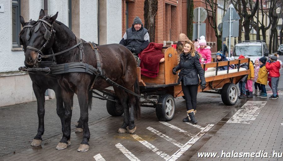 Hétfőn délelőtt kilenc órától gyermekcsoportok lepték el Kiskunhalas város főterét. A város több irányából, szinte egyszerre érkeztek a csoportok, hogy a városi Mikulásnak odaadják rajzaikat és átvegyék ajándékaikat. Az adventi díszekben pompázó tér mellett egy fogat is várt a legkisebbekre, akik kedvükre séta kocsikáztak a biztonságosan lezárt területen.