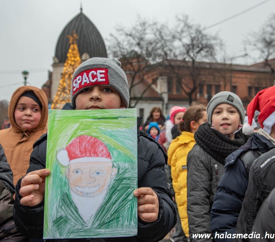A gyerekek kiscsoportokba verődve jelentkeztek a fehér szakállú, piros köntösbe öltözött Mikulásnál. Többen rajzot hoztak magukkal, mások köszöntő versikével készültek. Mindenki, aki találkozott a Mikulással ajándékkal térhetett haza. Úgy tűnik jók voltak a halasi gyerekek, mert egyetlen krampuszt sem láttunk a főtér környékén. Minden apróságon látszott a kíváncsi boldogság, amely a Mikulással való személyes kapcsolattal teljesedett ki.