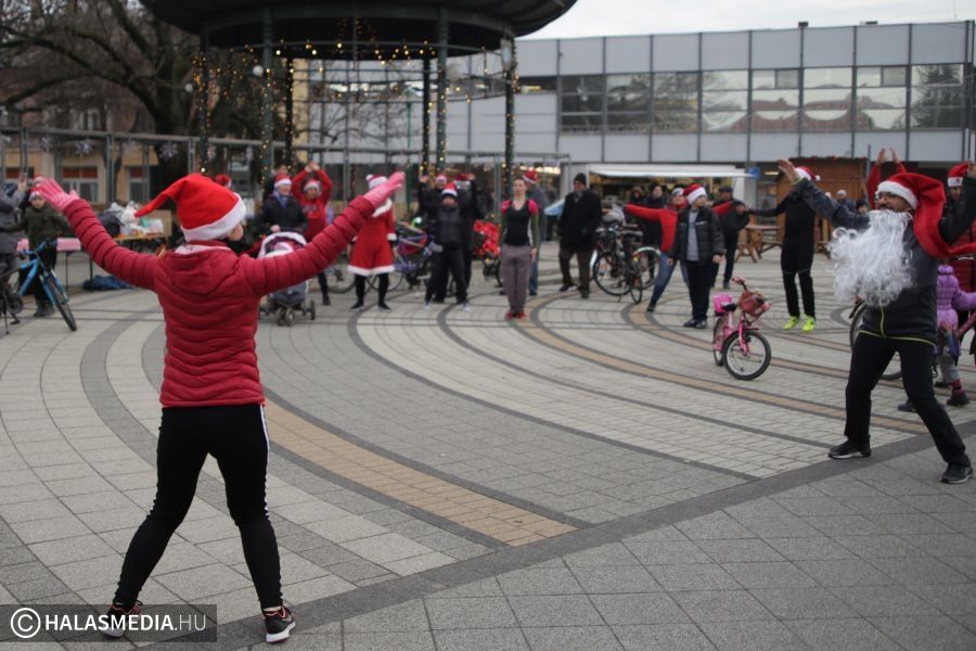 14:45-től egy zenés bemelegítéssel lehetett rákészülni a futásra, kerékpározásra. Természetesen Mikulásnak öltözött résztvevők segítségével zajlott a közös torna.