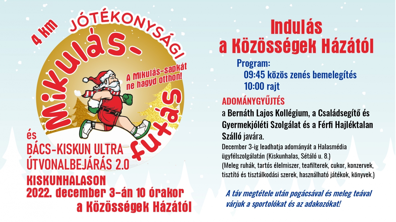 Kiskunhalasra is ellátogat a Mikulás. Többféle program várja az érdeklődőket. Már lehet gyűjteni az adományokat és készülni a közös kocogásra. December 3-án Jótékonysági Mikulás-futás lesz Kiskunhalason. A közös bemelegítést követően 10 órakor rajtol el a Mikulás sapkás futók mezőnye a mintegy 4 kilométeres távra. Ez az esemény egyben a Bács-Kiskun Ultra útvonalbejárás 2.0 is.