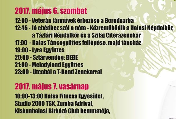 A gasztronómia mellett természetesen idén is nagy hangsúlyt kapnak a kulturális programok. A mai napon többek között a Kiskunhalasi Városi Fúvószenekar tagjai és a Kiskun Táncegyüttes tagjai álltak színpadra. Egyetlen Borudvarról sem hiányozhatnak a Vivat Bacchus tagjai. Ma is nagy sikerük volt a halasiak körében.
