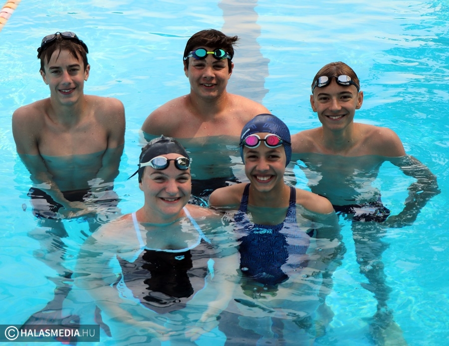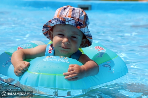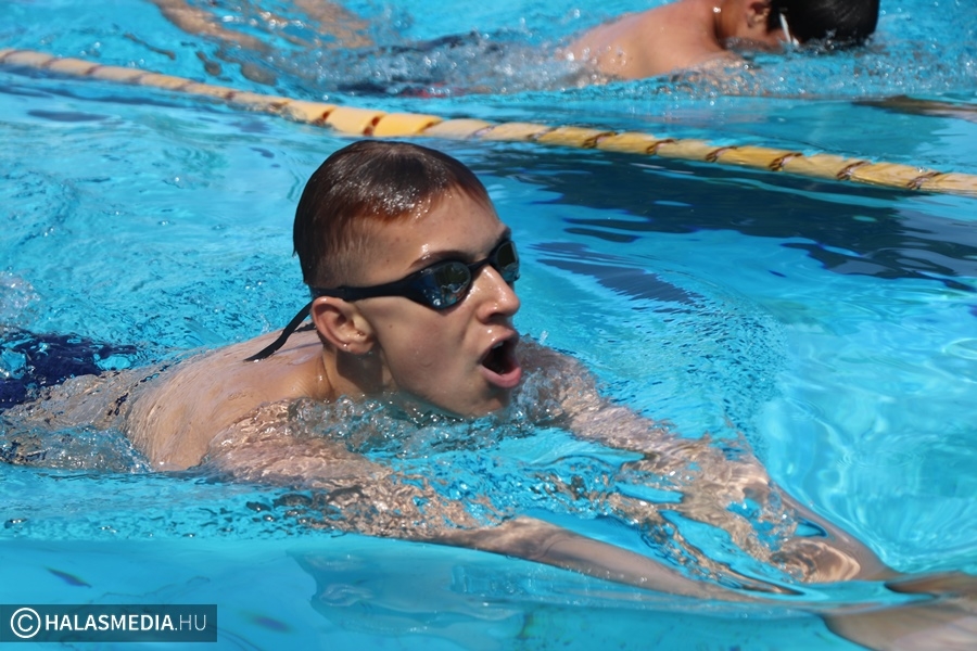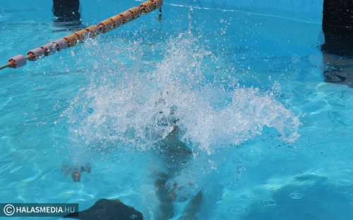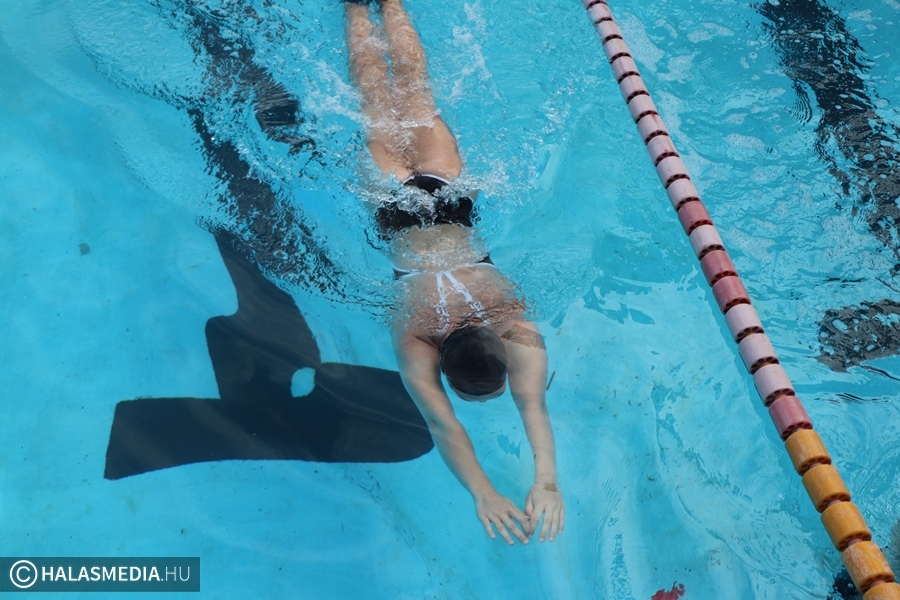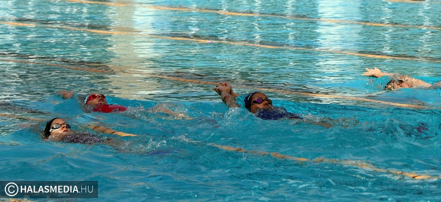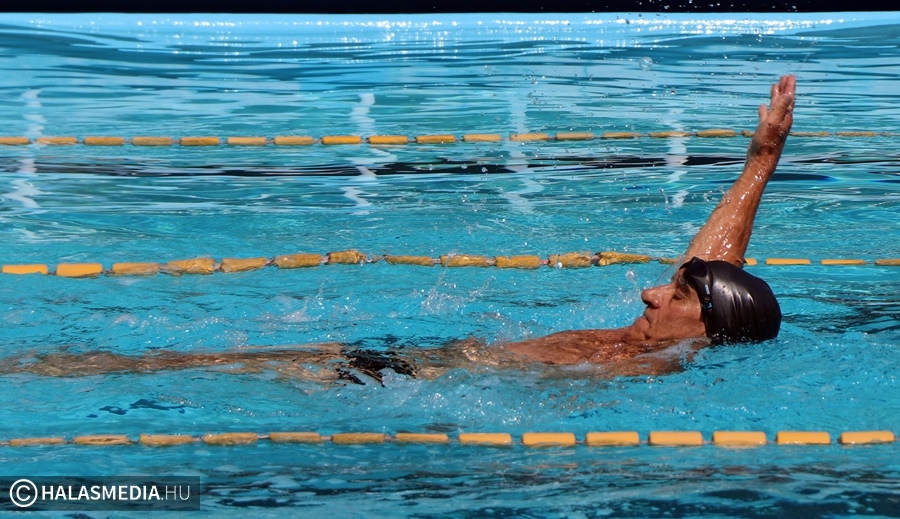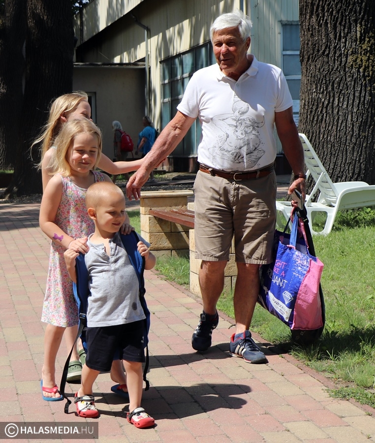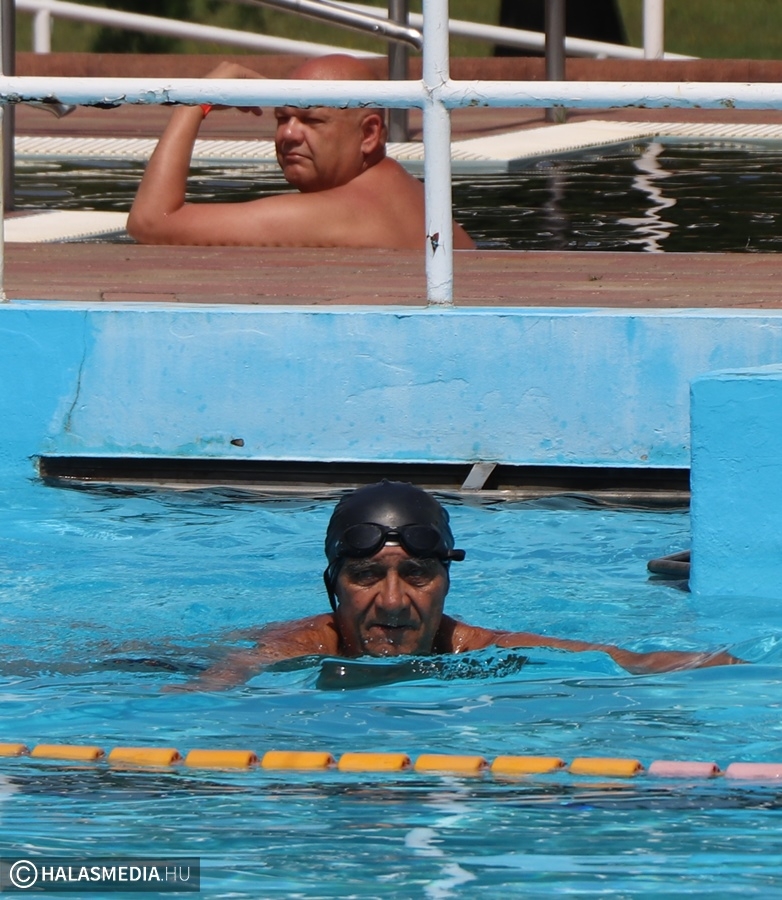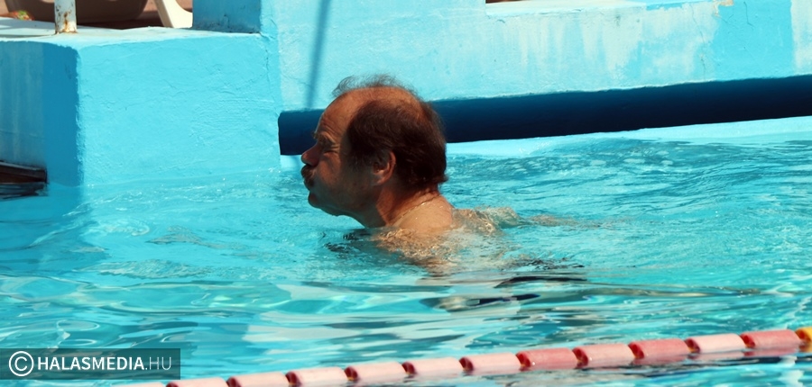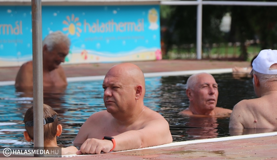 A kinti termálvizes medencében több generáció tagjai beszélgettek, míg néhány méterrel odébb, a köznyelv által csak nagymedenceként emlegetett részben Novotny Attila és Csontos Kristóf vezetésével úszóedzések zajlanak. Persze volt szabad pálya is, azt is többen kihasználták. A gyermekpancsolóban pedig néhány gyerkőc fürdőzött. Ott jártunk idején volt élet a halasi strand területén. Sümeghy László unokáival volt kint a fürdőben és megszólította a generációja képviselőit.