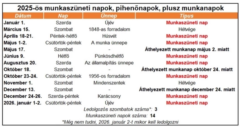 2025 szabadnapok terén hozhat egy kis nehézséget az év végén, a 2026-os év elején, miután Szilveszter 2025-ben szerdára, a 2026 Újév napja csütörtökre esik majd. Tehát az újév 2026-os ünneplésére ideje előre felkészülni, mert január 1-2. is munkaszüneti nap lesz. Másodikát még nem tudni, mikor kell majd ledolgozni szombaton.
