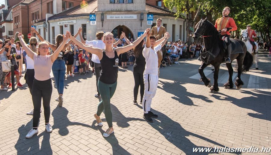 Az ütemesen haladó menet a Kossuth utcán, több helyen megállt, és a táncosok az ott gyülekezett népnek rögtönzött műsort adtak. Sőt, volt, hogy bevonták a közönséget is a mutatványba. A városon végigmasírozók élén a lovasok haladtak. A paripás had elején a Kiskunhalasi Lovasbandérium kíséretében ifj. Szegedi Gábor puszta fogathajtó és Prantner Péter huszár tiszt vitték a bandérium zászlaját, mögöttük a markotányos nők, majd a Nemzeti Lovas Színház művészei haladtak. A Lovasok hadát Sz. Kovács Tibor hagyományőrző csikós csapata zárta.