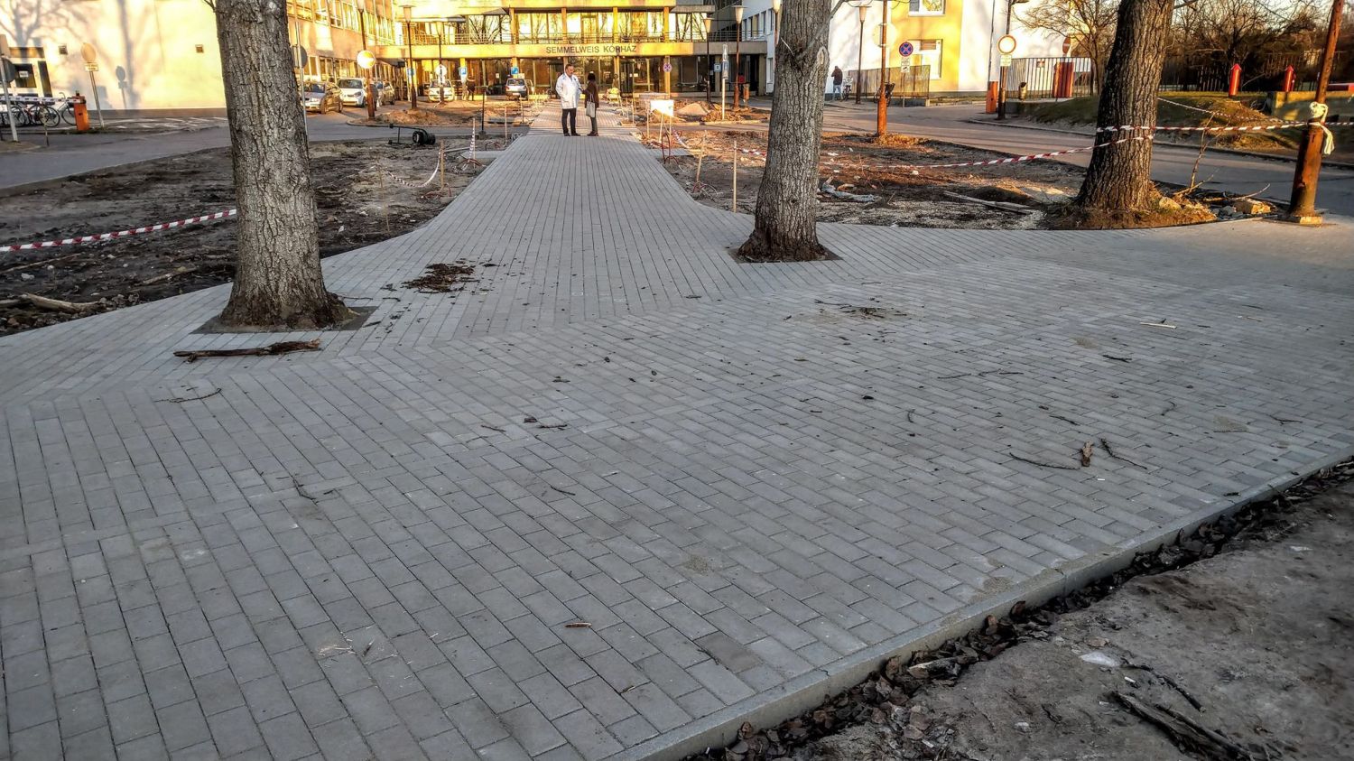 A kórház előtti sétány kialakítása folyamatban van, a járdafelületeket már elkészítették a kivitelezők. Az átalakítás célja az, hogy a betegek, hozzátartozók ezen a felületen jussanak be a kórházba, az kórház felé vezető úttest pedig megmarad az autóknak és az ide érkező mentőknek.
